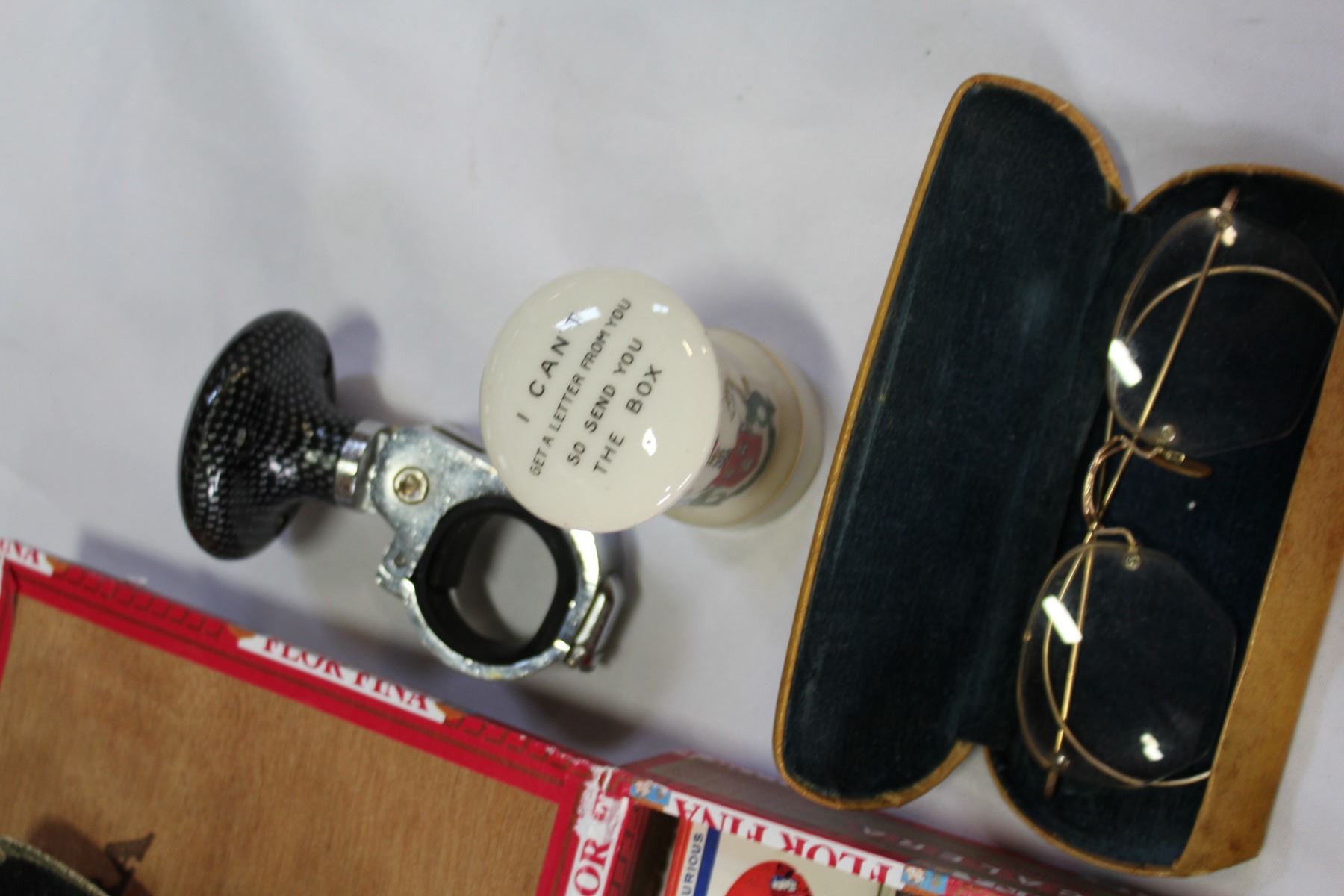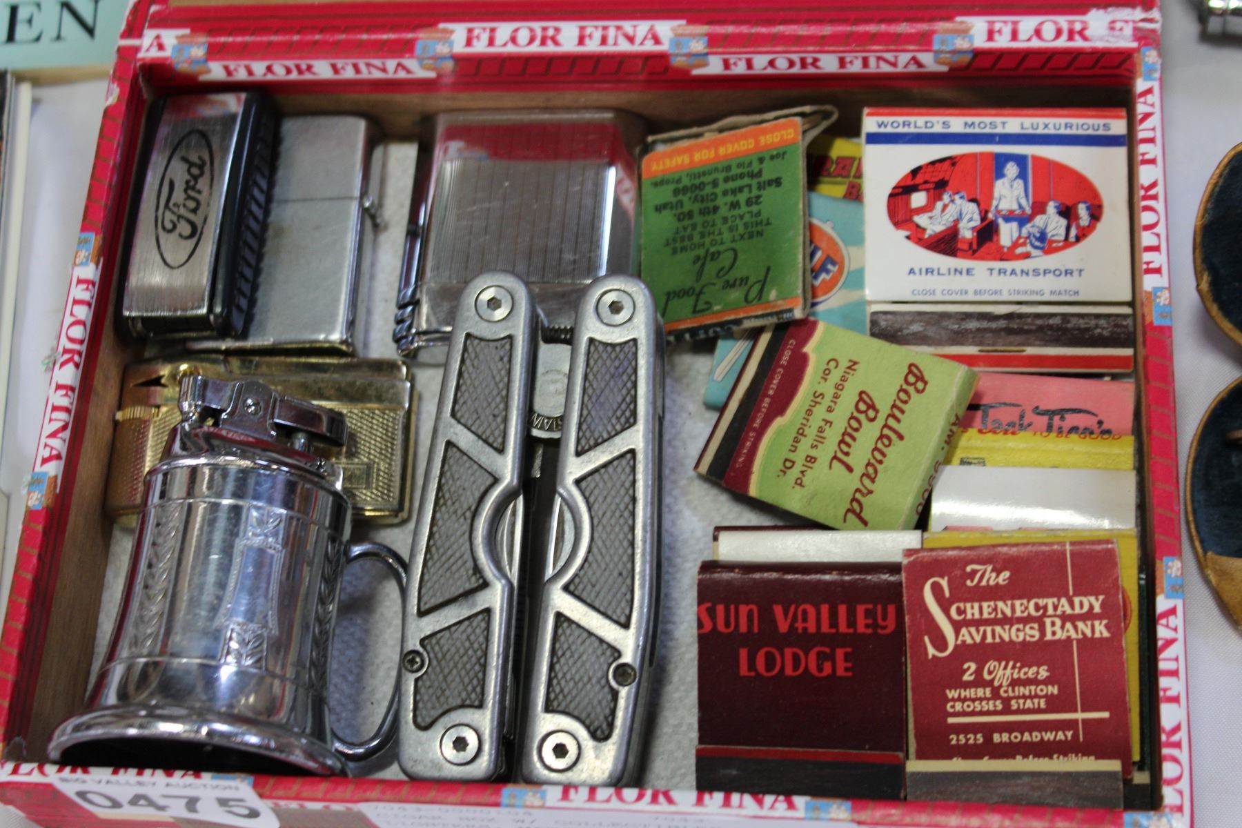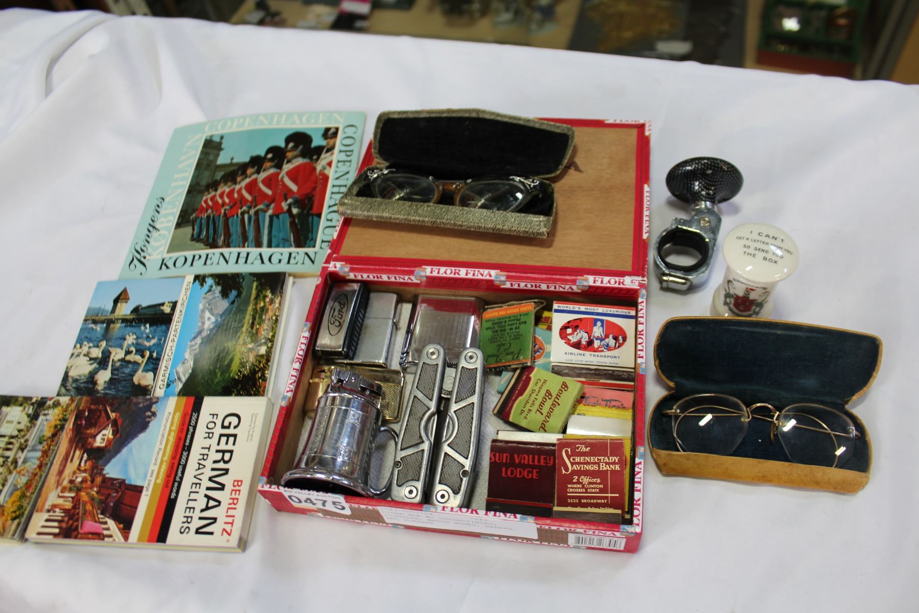 CIGAR BOX W/ COLLECTIBLES, LIGHTERS, MATCH BOOKS, PAPERS, AND GLASSES
