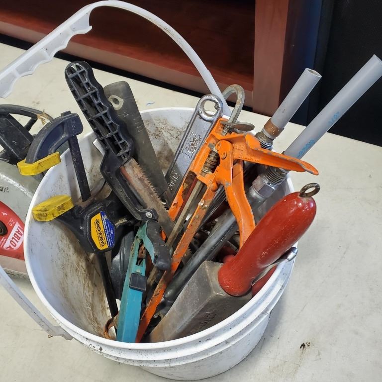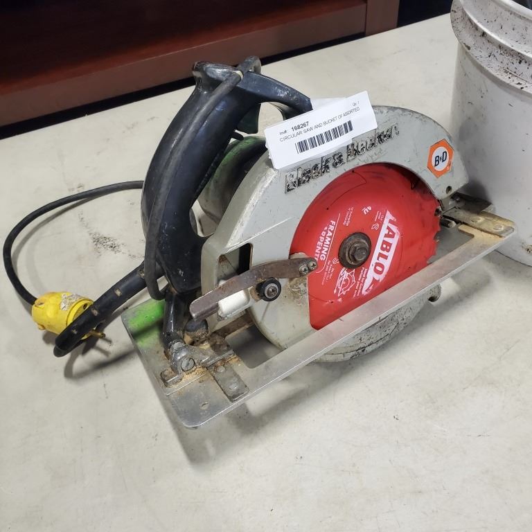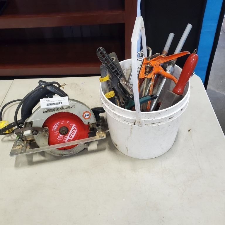CIRCULAR SAW AND BUCKET OF ASSORTED CLAMPS, FILES, WRENCHES, SAWS ETC
