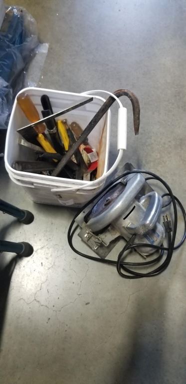 CIRCULAR SAW AND BUCKET OF ASSORTED TOOLS