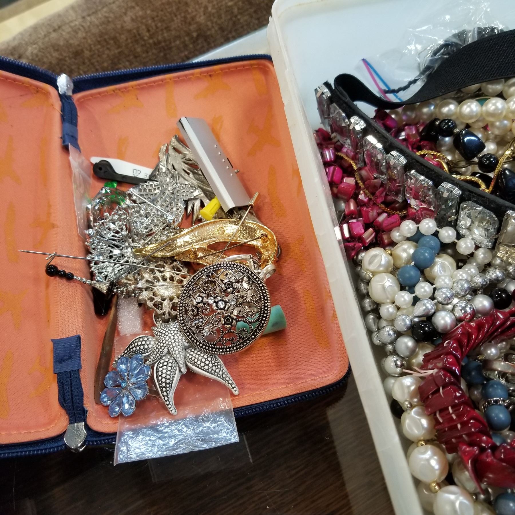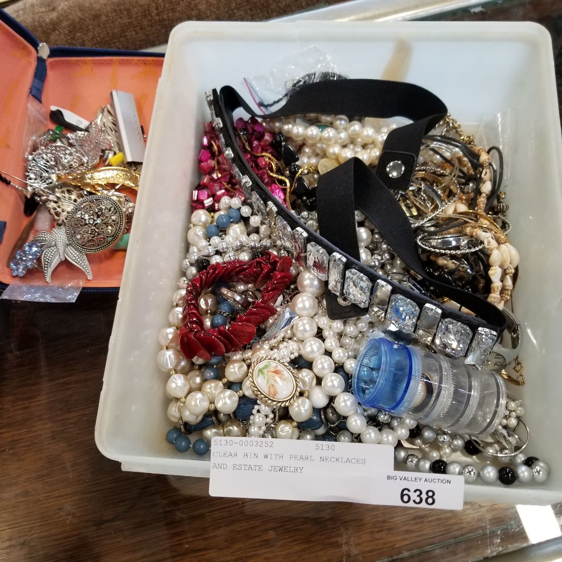 CLEAR BIN WITH PEARL NECKLACES AND ESTATE JEWELRY