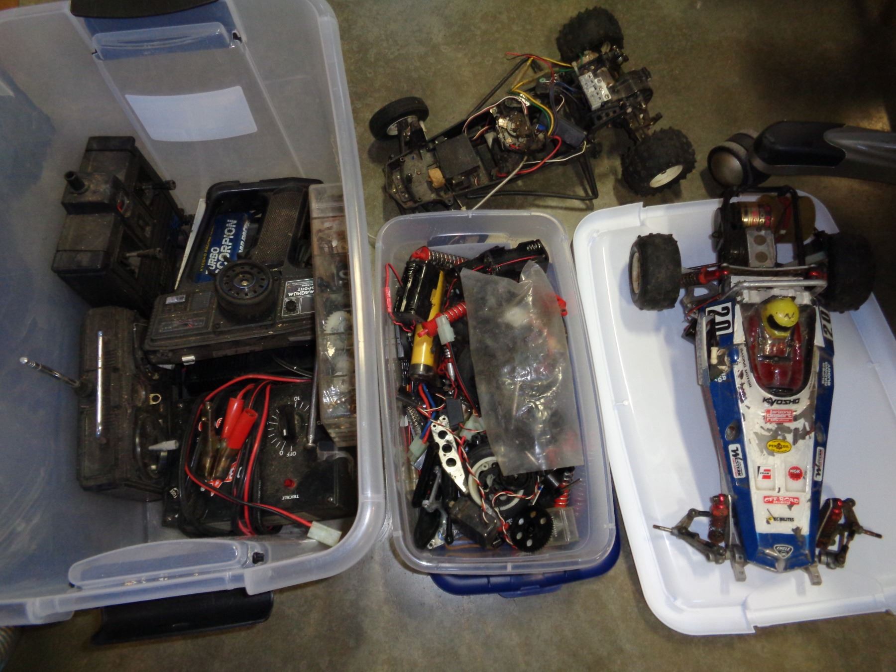 CLEAR TOTE OF HIGH END RC CARS, PARTS, AND ACCESSORIES