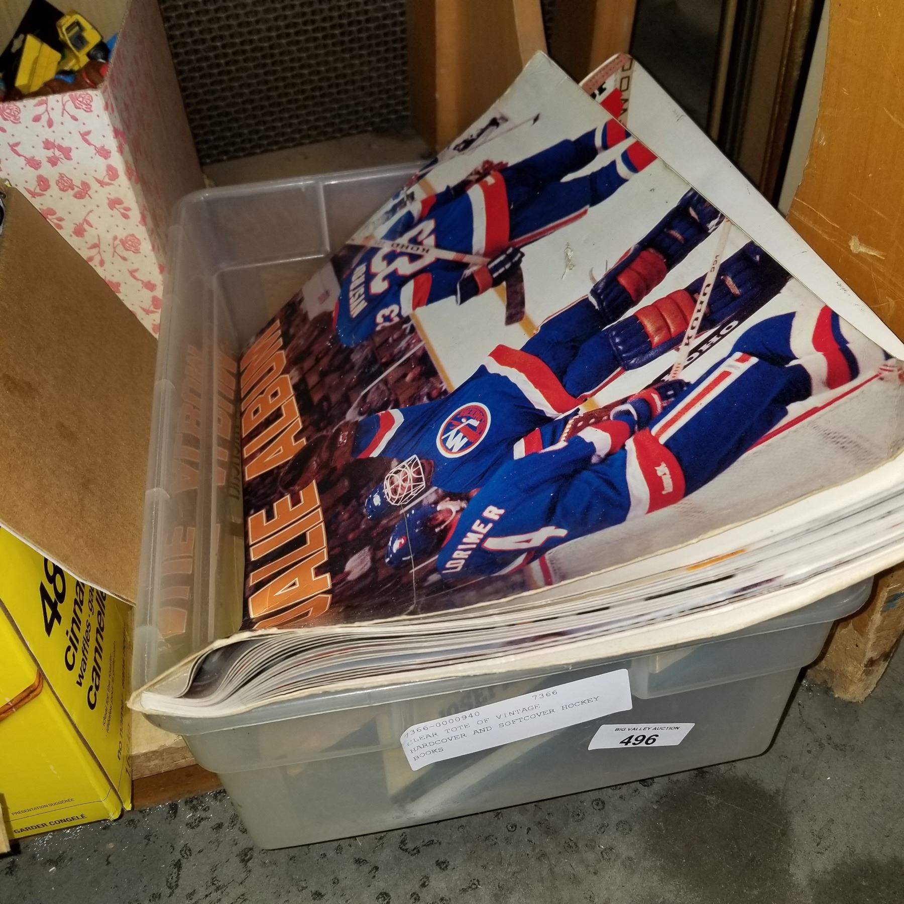 CLEAR TOTE OF VINTAGE HARDCOVER AND SOFTCOVER HOCKEY BOOKS