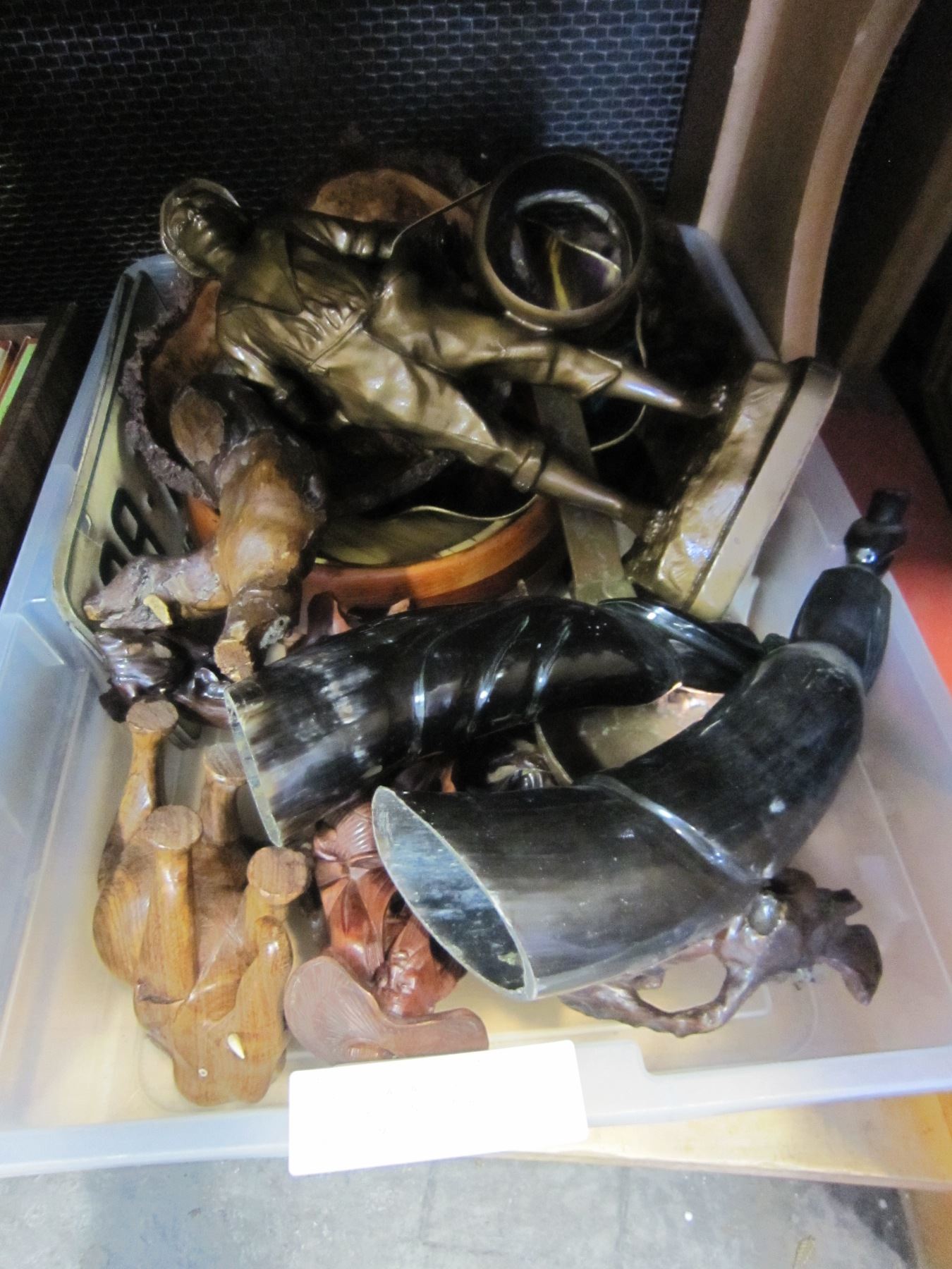 CLEAR TOTE W/ WOODEN COLLECTIBLES AND VINTAGE ESTATE ITEMS