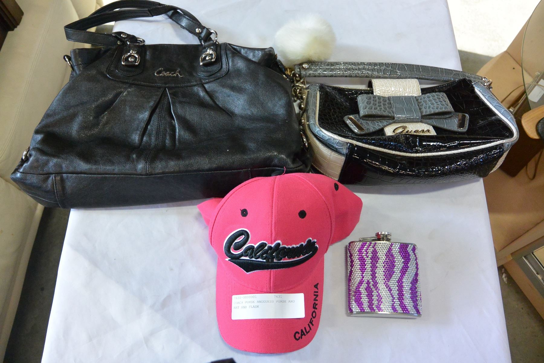 COACH PURSE ANDGUESS PURSE AND HAT AND FLASK