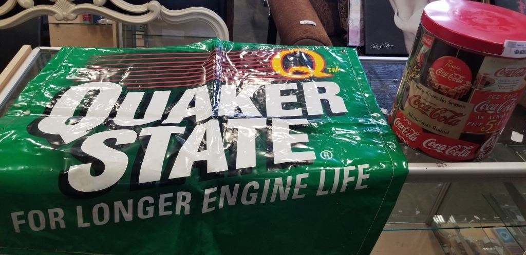COCA COLA TIN WITH ASSORTED COLLECTIBLES AND MILLER BANNER