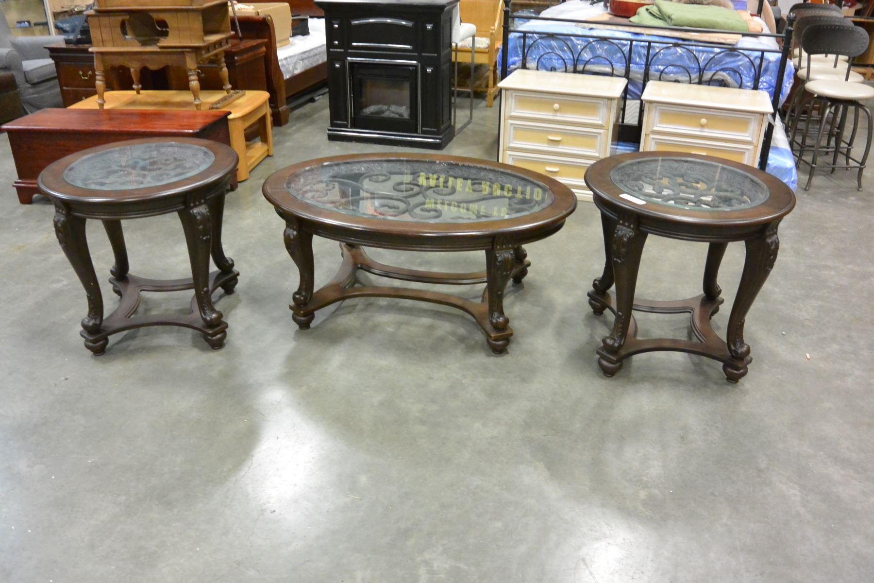 COFFEE TABLE AND 2 END TABLES W/ GLASS INSERTS