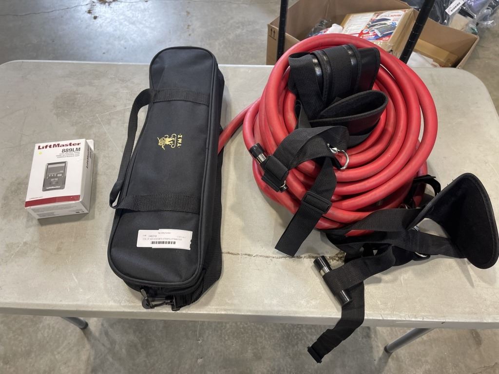COIL OF AIR HOSE WITH STRAPS LIFTMASTER CONTROL PANEL AND ASSORTED ITEMS