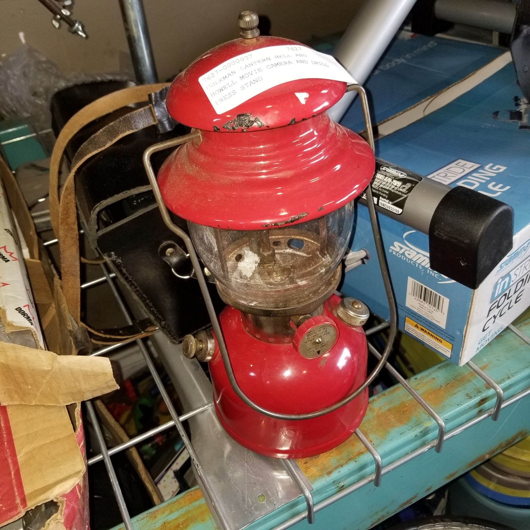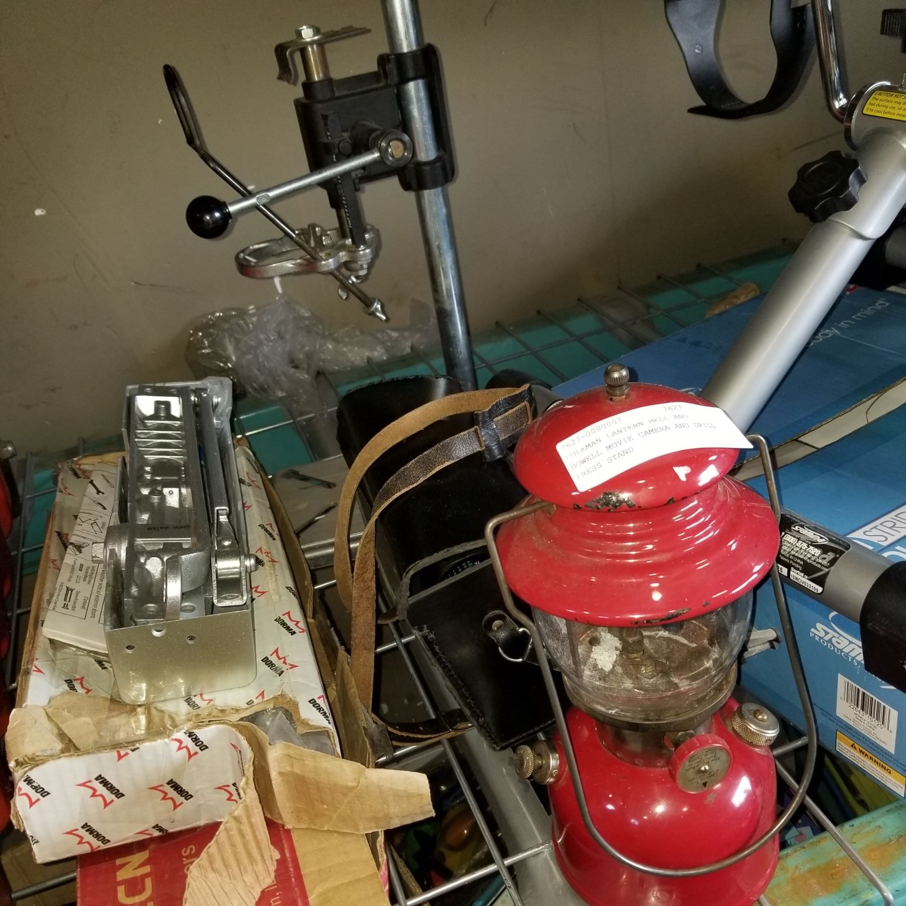COLEMAN LANTERN BELL AND HOWELL MOVIE CAMERA AND DRILL PRESS STAND