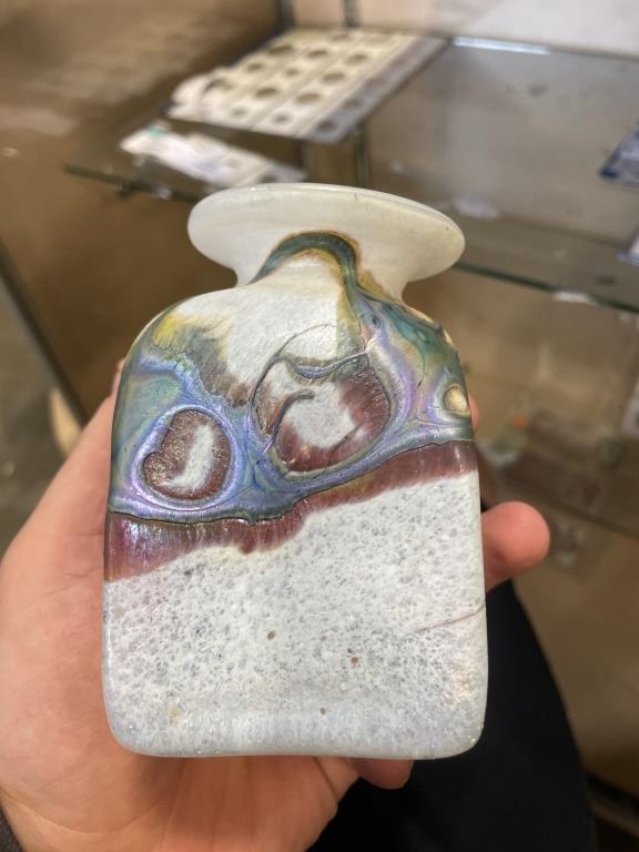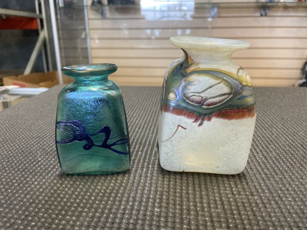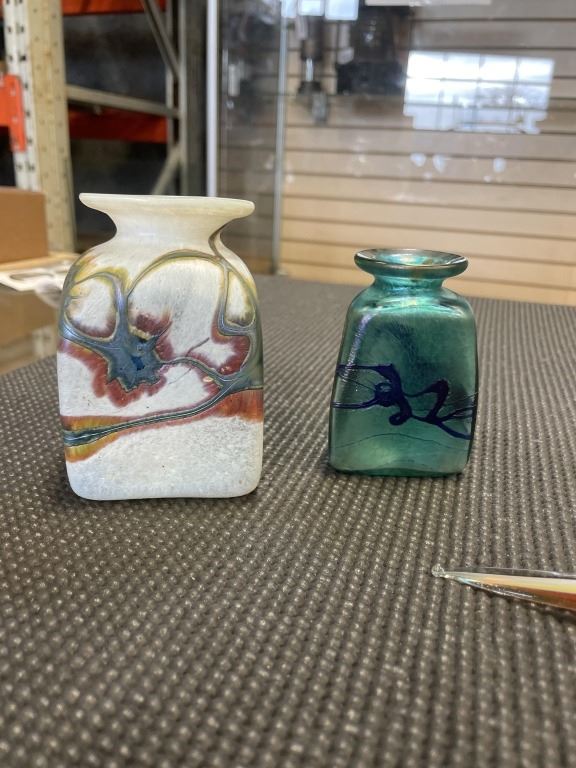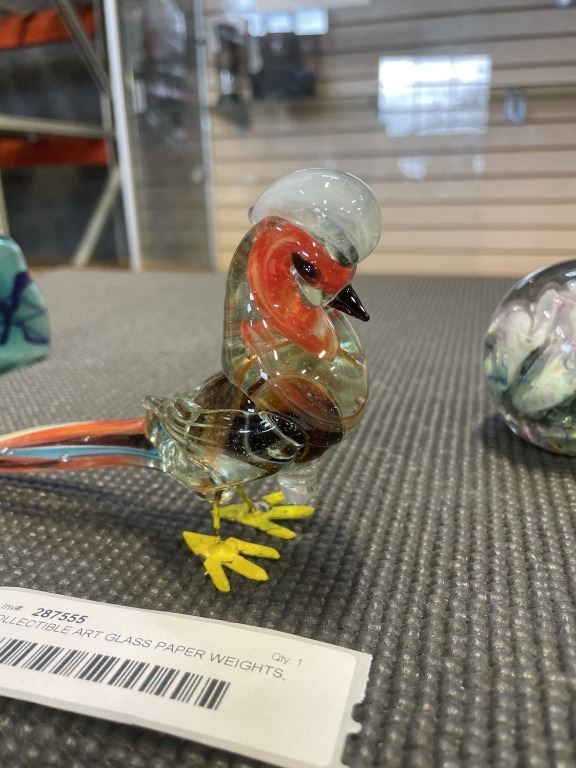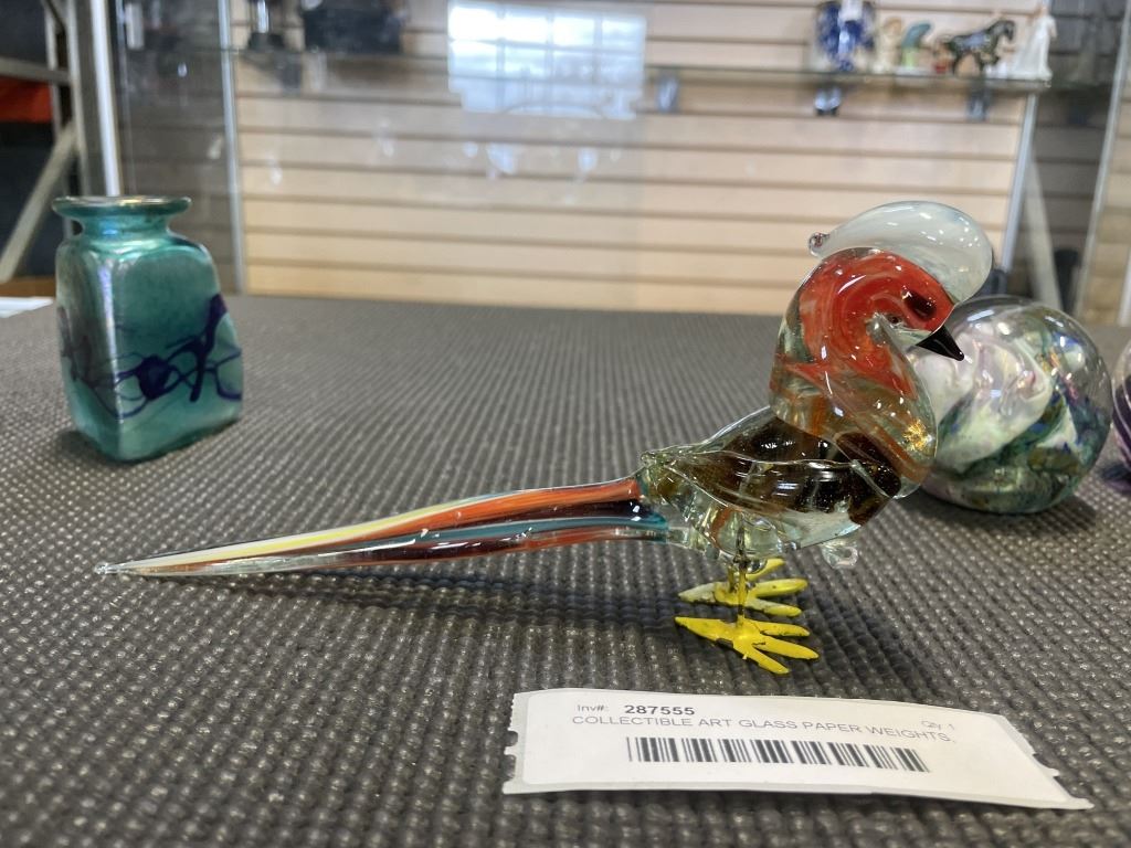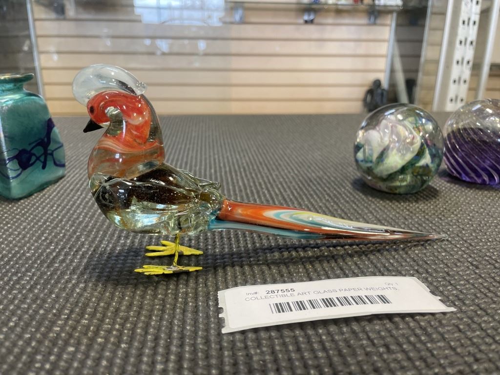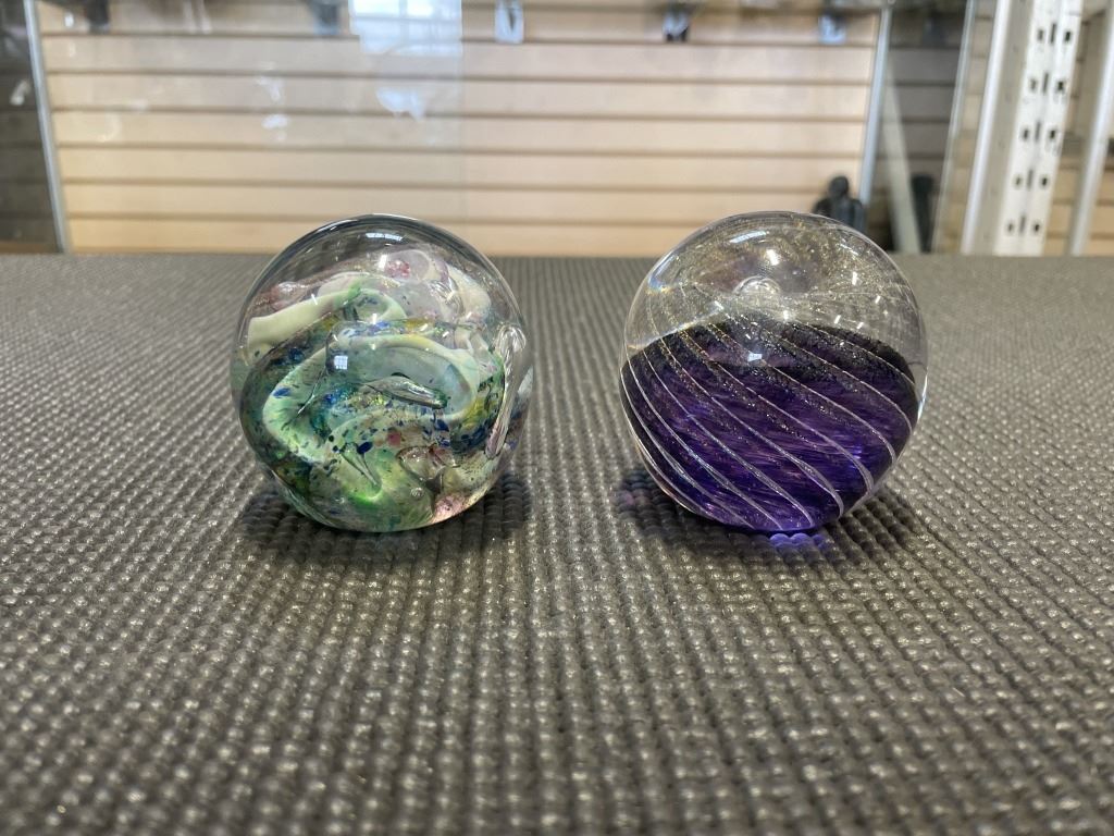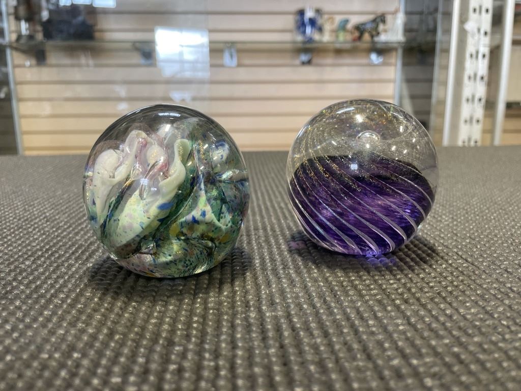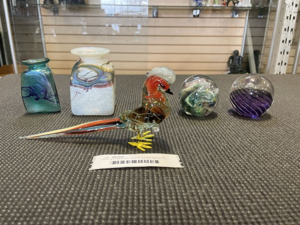 COLLECTIBLE ART GLASS PAPER WEIGHTS, AND 2 SMALL VASES