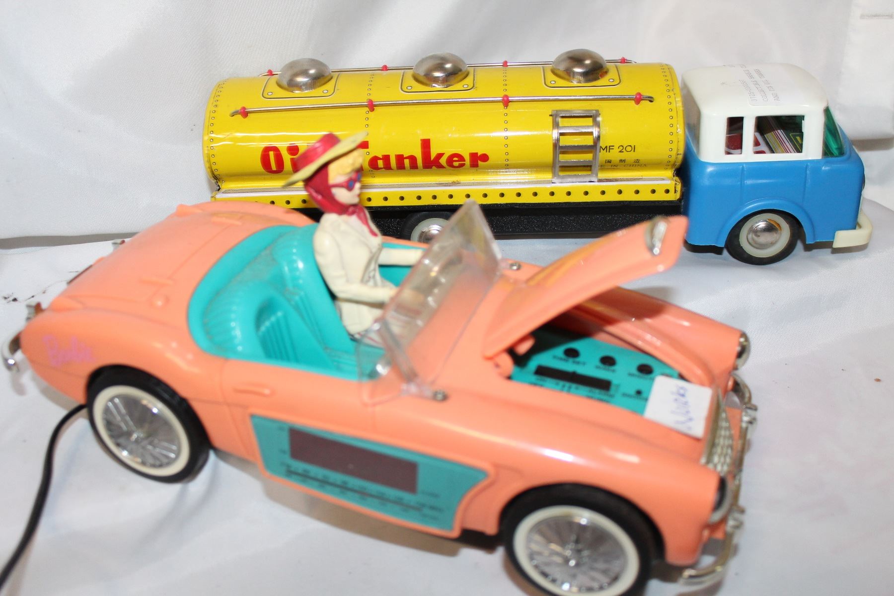 COLLECTIBLE BARBIE CLOCK RADIO AND TIN OIL TANKER