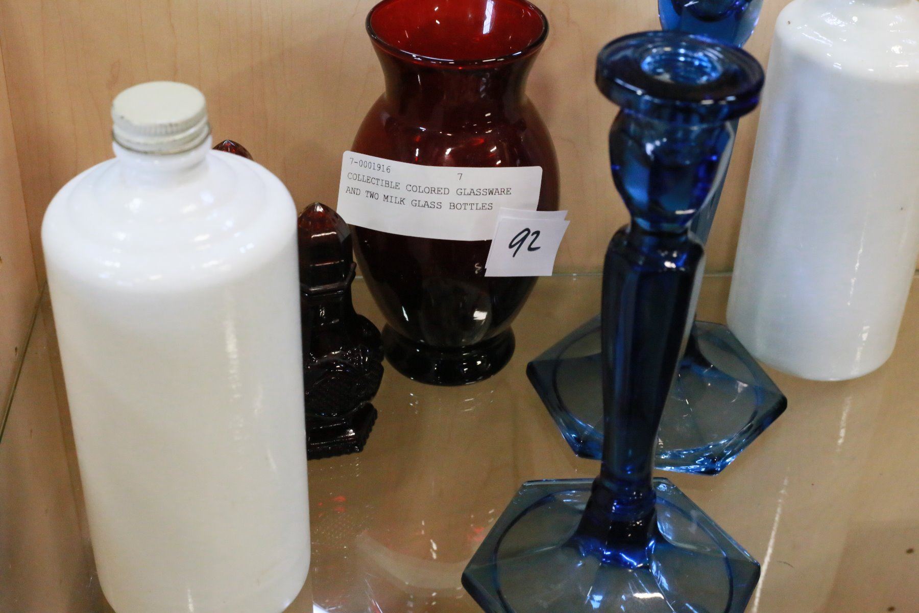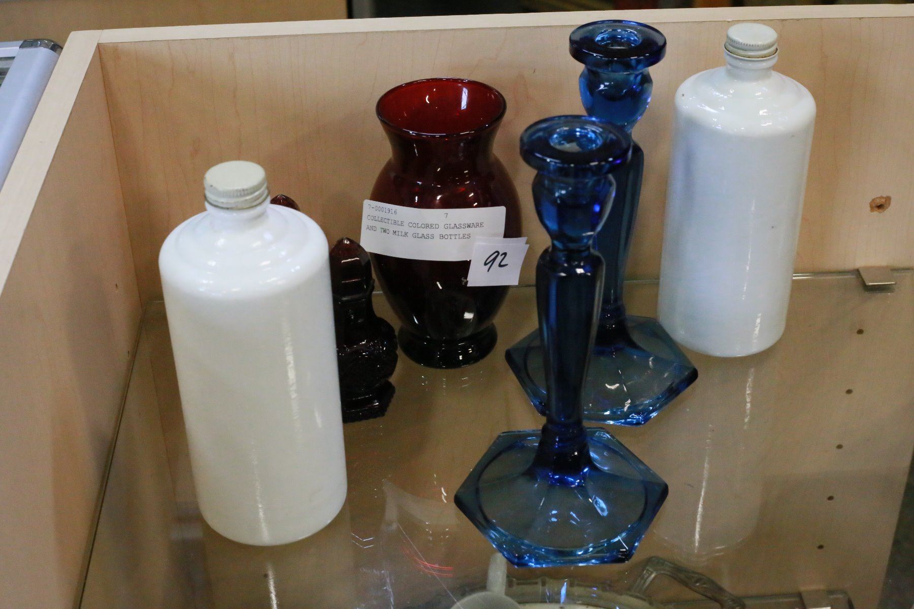 COLLECTIBLE COLORED GLASSWARE AND TWO MILK GLASS BOTTLES