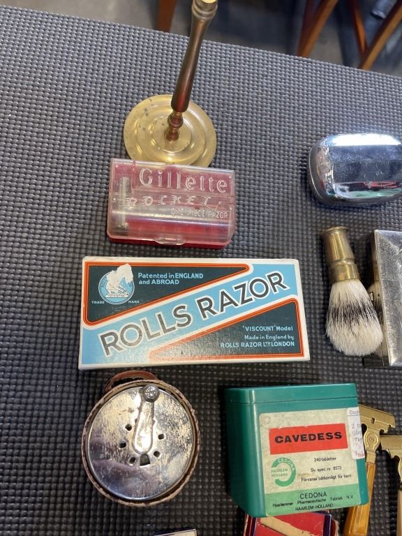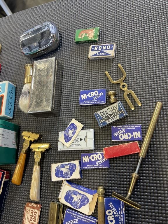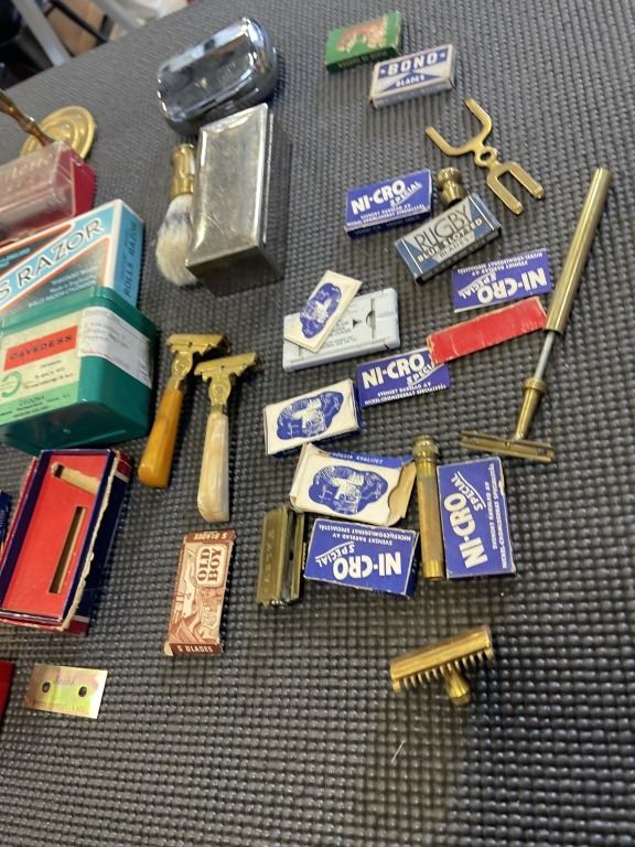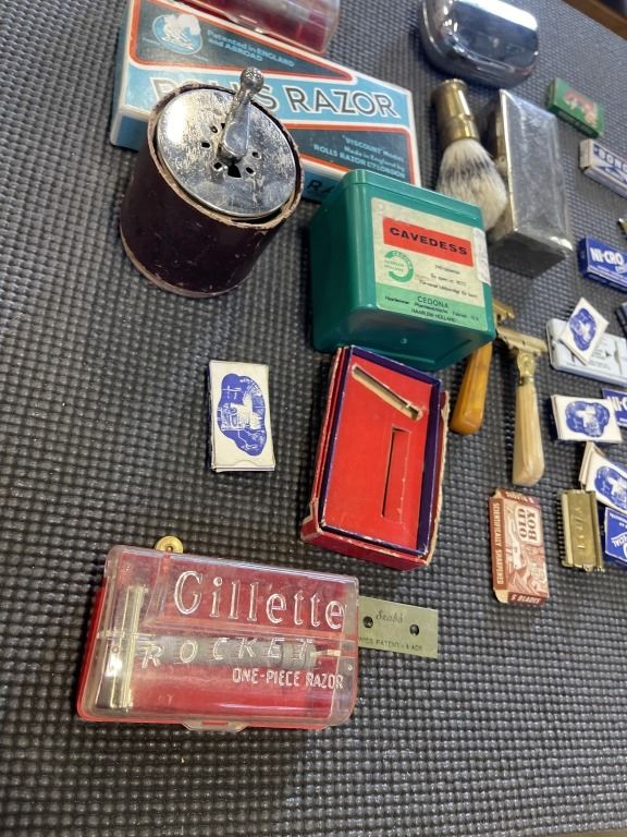 COLLECTION OF ANTIQUE RAZORS AND SHAVING ACCESSORIES