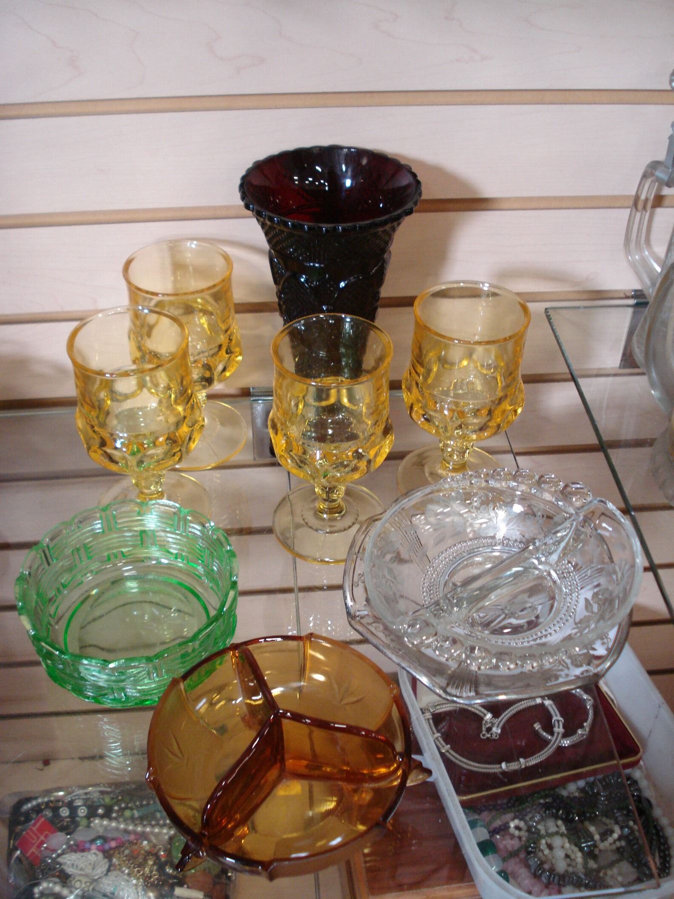 COLORED GLASSWARE AND THUMB PRINT GLASSES
