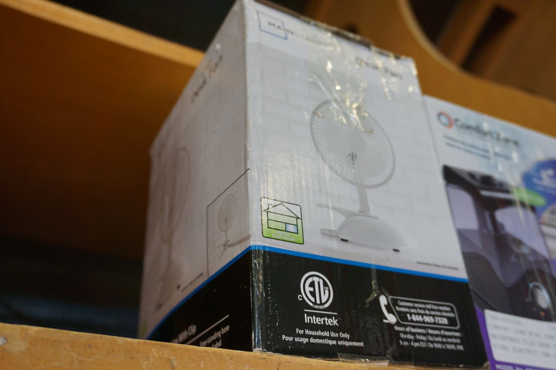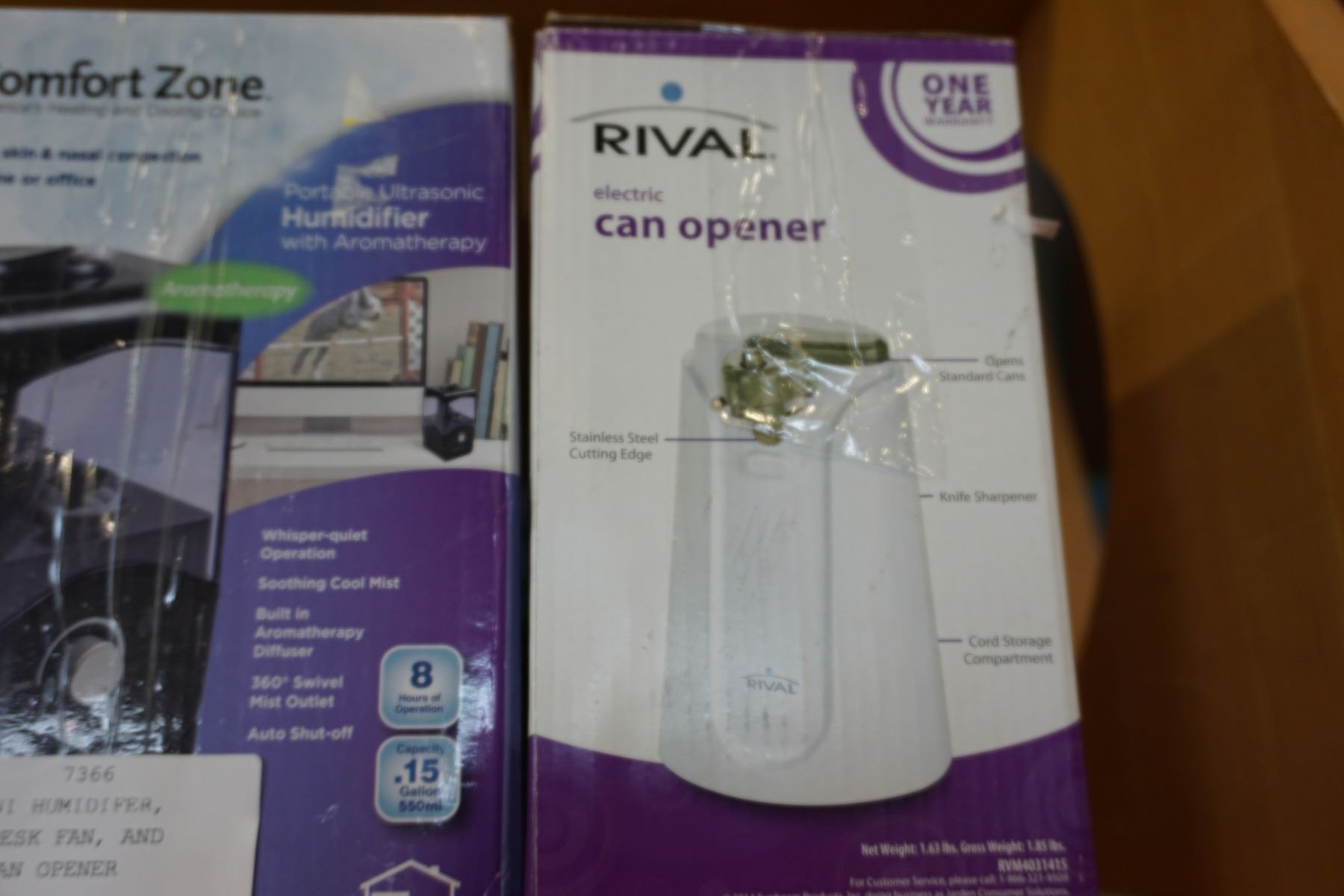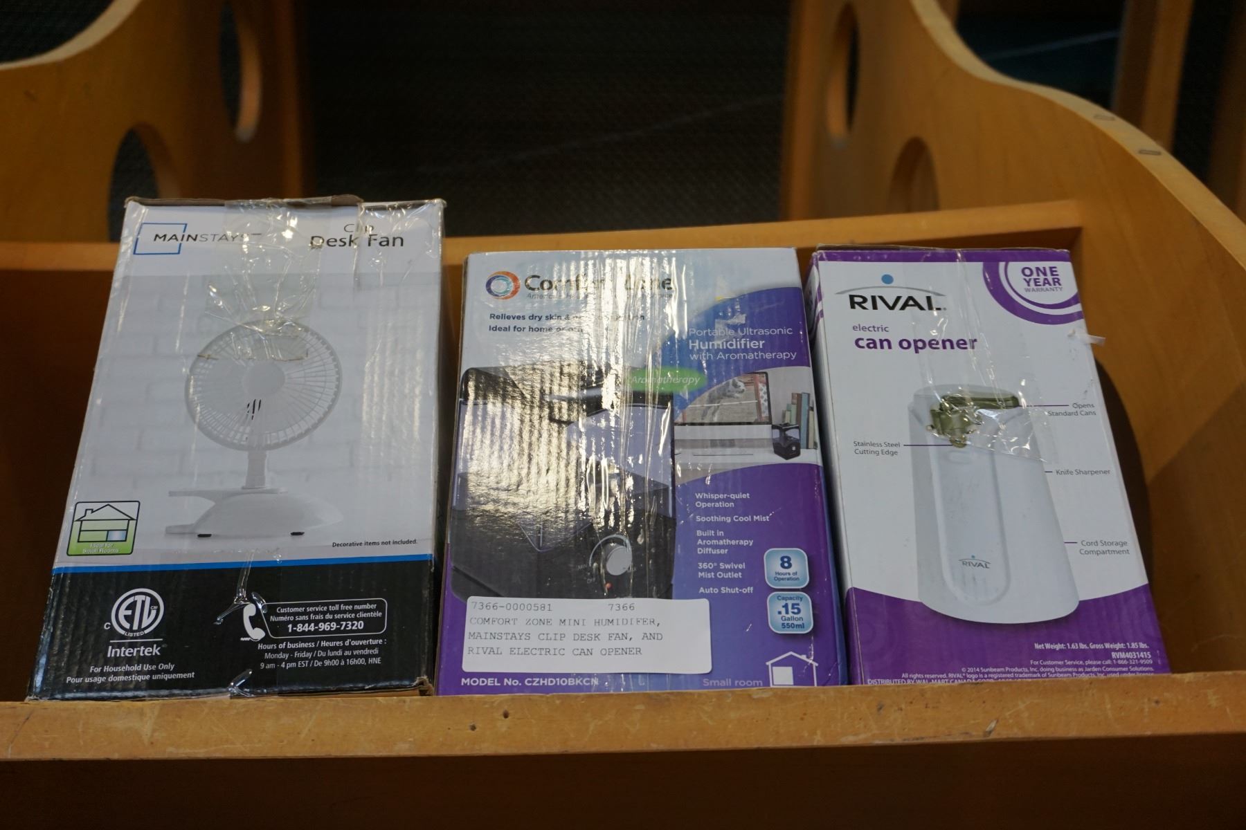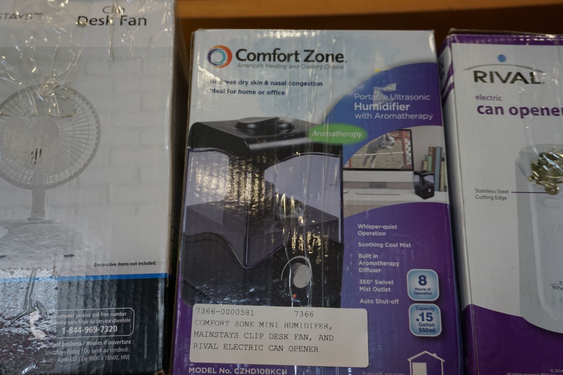 COMFORT ZONE MINI HUMIDIFER, MAINSTAYS CLIP DESK FAN, AND RIVAL ELECTRIC CAN OPENER