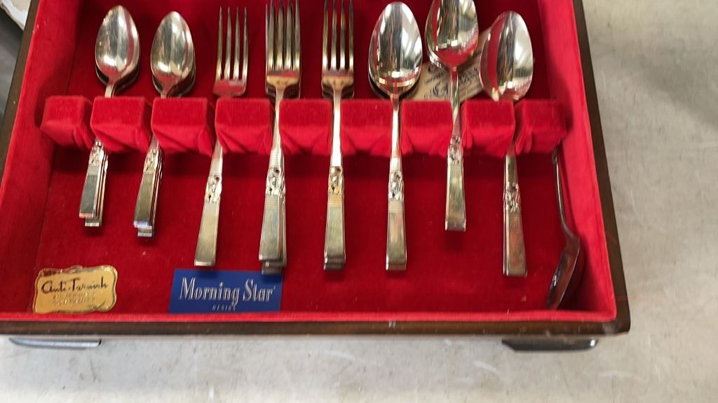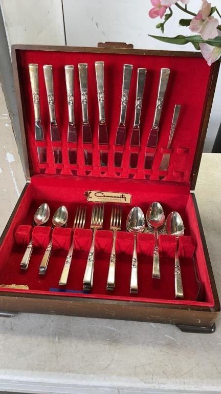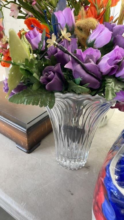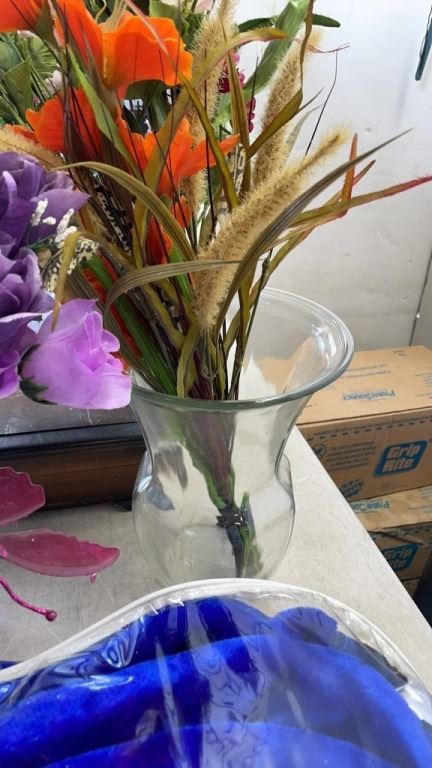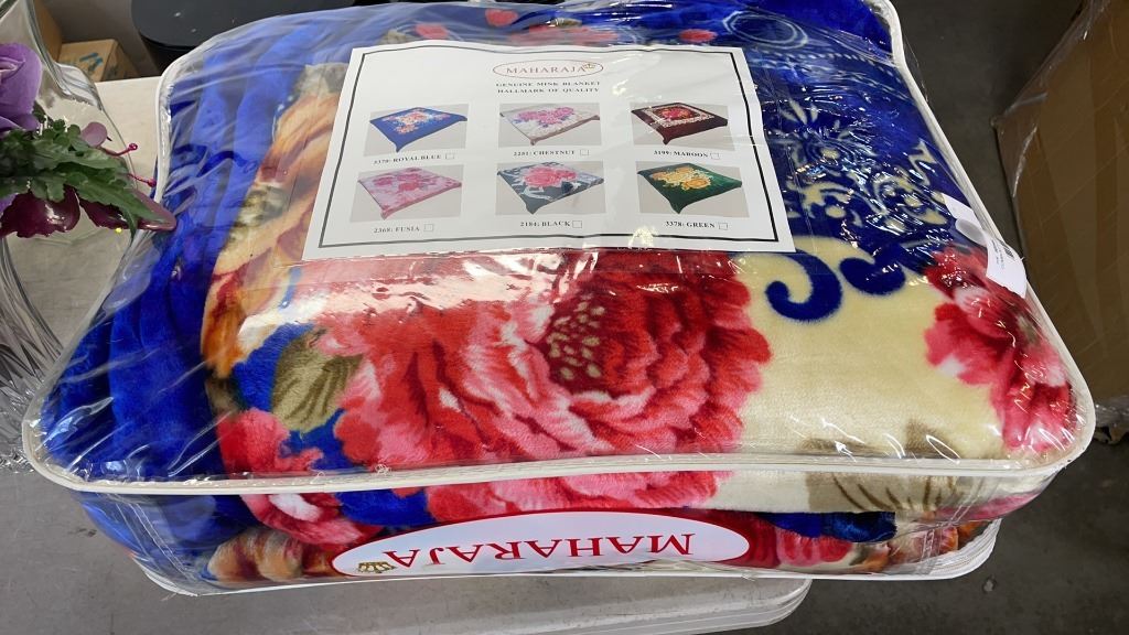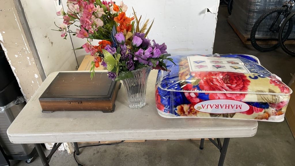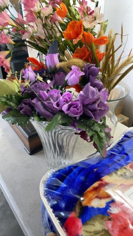 COMMUNITY CUTLERY IN CANTEEN, MAHARAJA MINK BLANKET AND 2 GLASS VASES WITH ARTIFICIAL FLOWERS