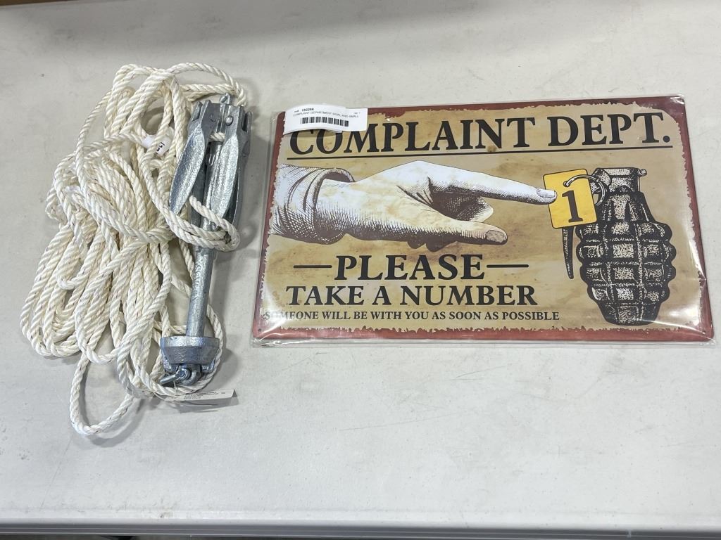 COMPLAINT DEPARTMENT SIGN, AND SMALL BOAT ANCHOR WITH LINE