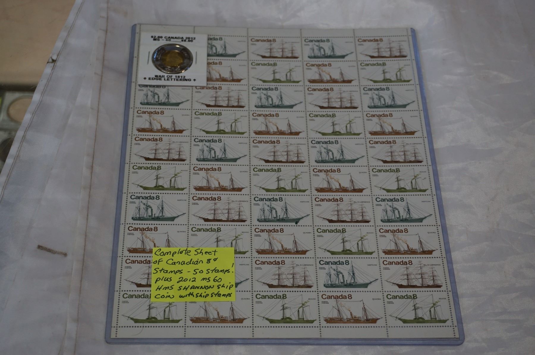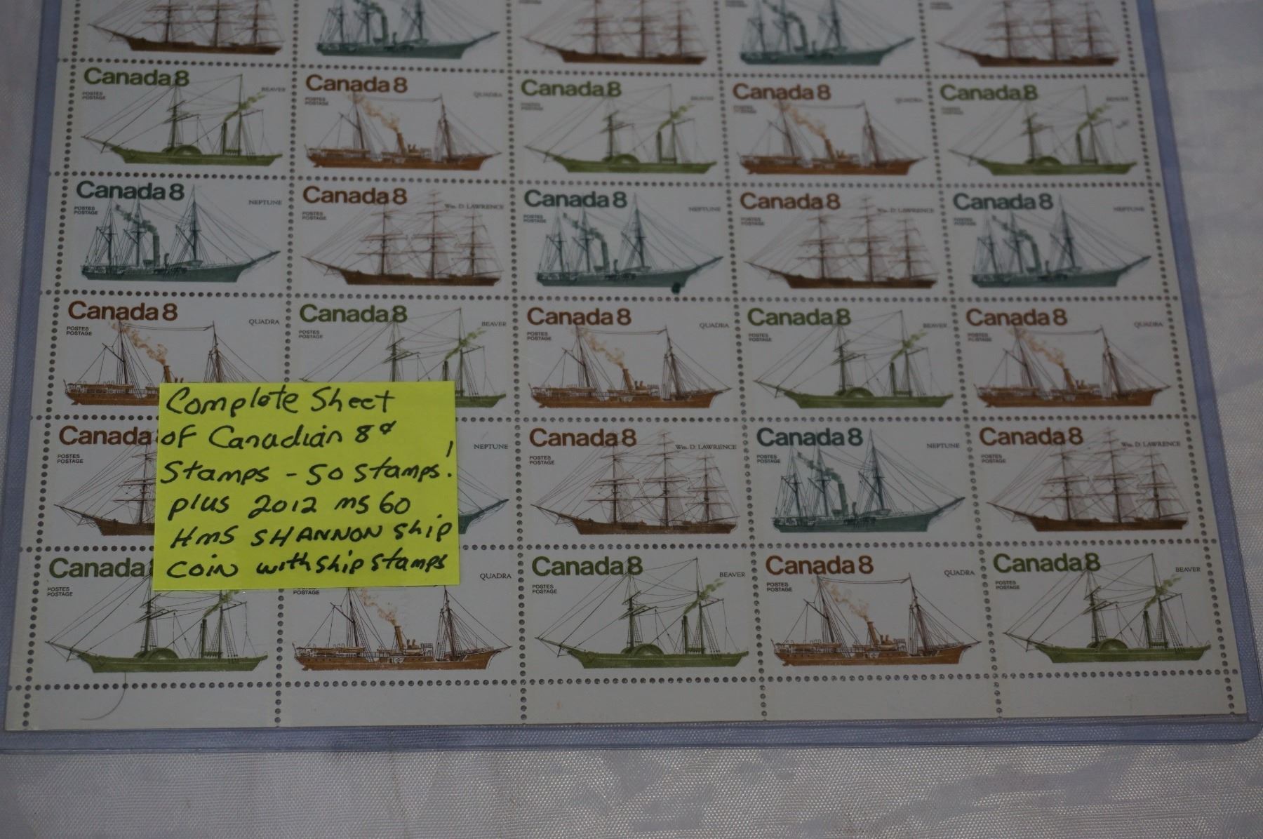 COMPLETE SHEET CANADIAN 8c STAMPS, 50 STAMPS PLUS 2012 MS60 HMS SHANNON SHIP COIN