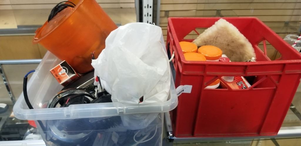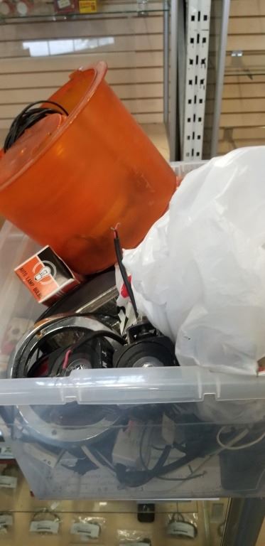 CONTAINER OF ASSORTED AUTOMOTIVE CLEANERS, AND TOTE OF EMERGENCY LIGHTS, AUTOMOTIVE LIGHTS AND WIRIN