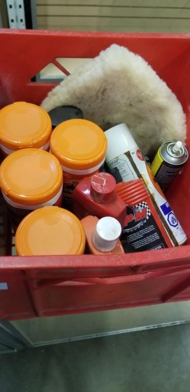 CONTAINER OF ASSORTED AUTOMOTIVE CLEANERS, AND TOTE OF EMERGENCY LIGHTS, AUTOMOTIVE LIGHTS AND WIRING