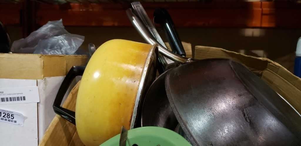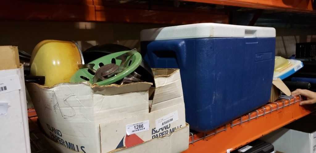 COOLER, PROPANE STOVE, PORTABEL LAMP, KETTLES, PANS