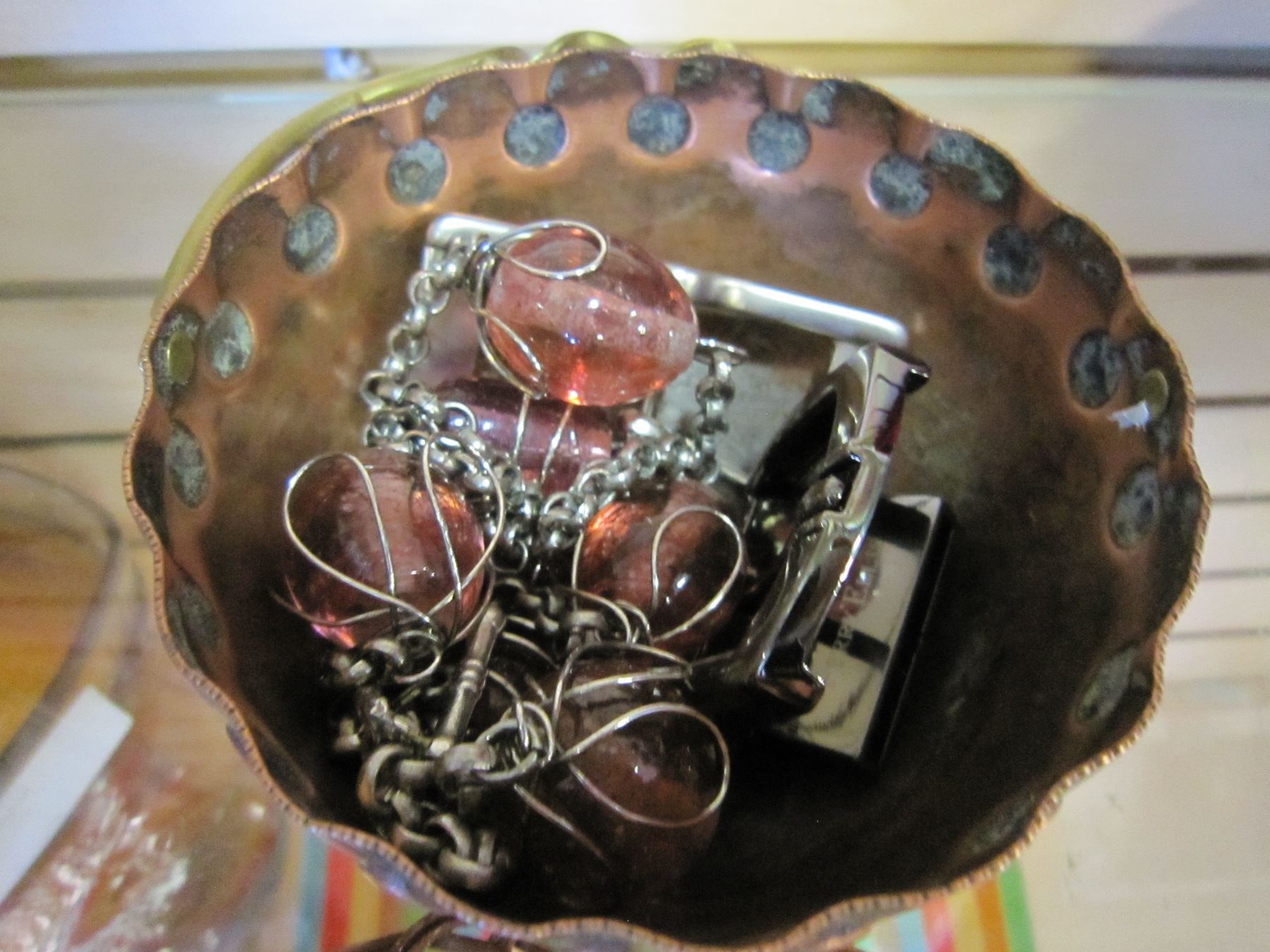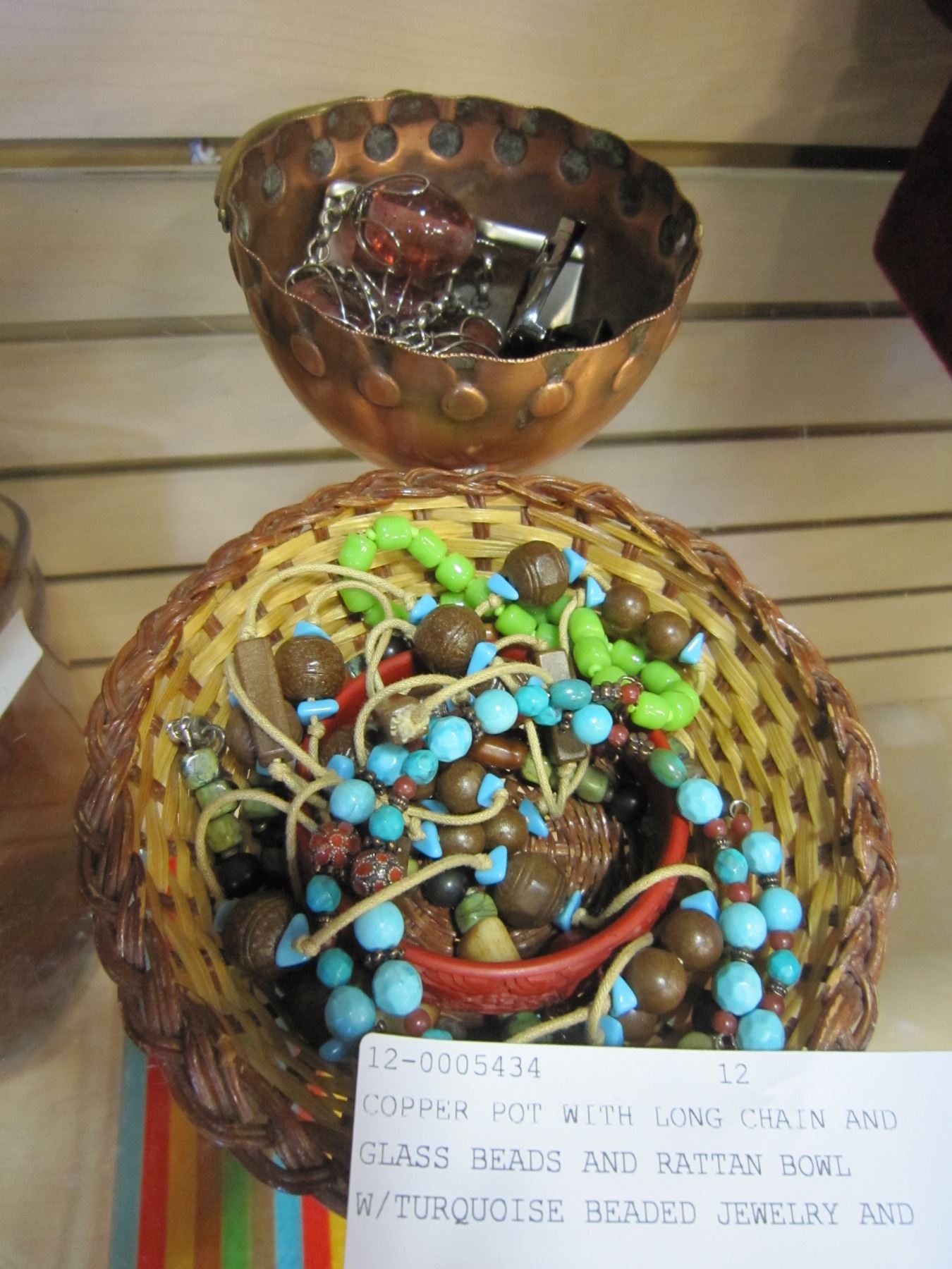 COPPER POT WITH LONG CHAIN AND GLASS BEADS AND RATTAN BOWL W/TURQUOISE BEADED JEWELRY AND CINNIBAR AND OTHER BRACELETS