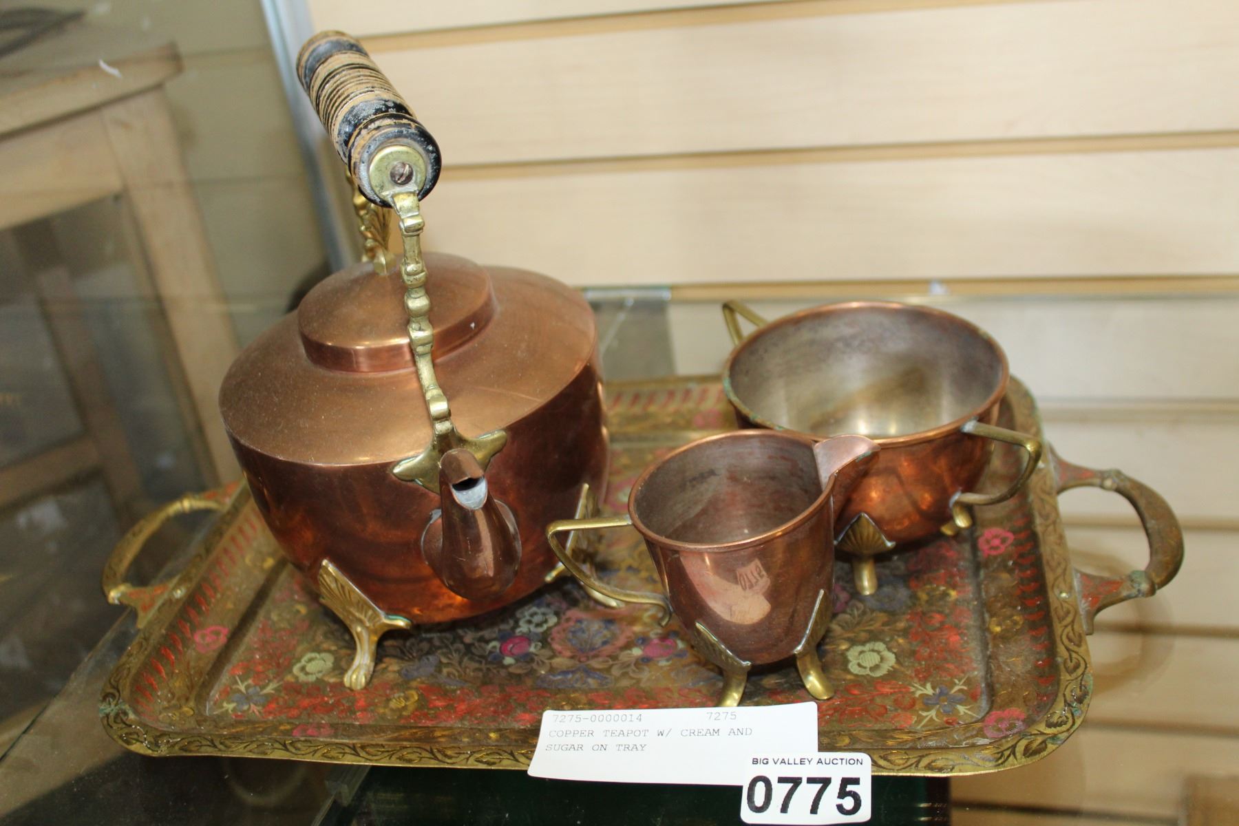 COPPER TEAPOT W/ CREAM AND SUGAR ON TRAY