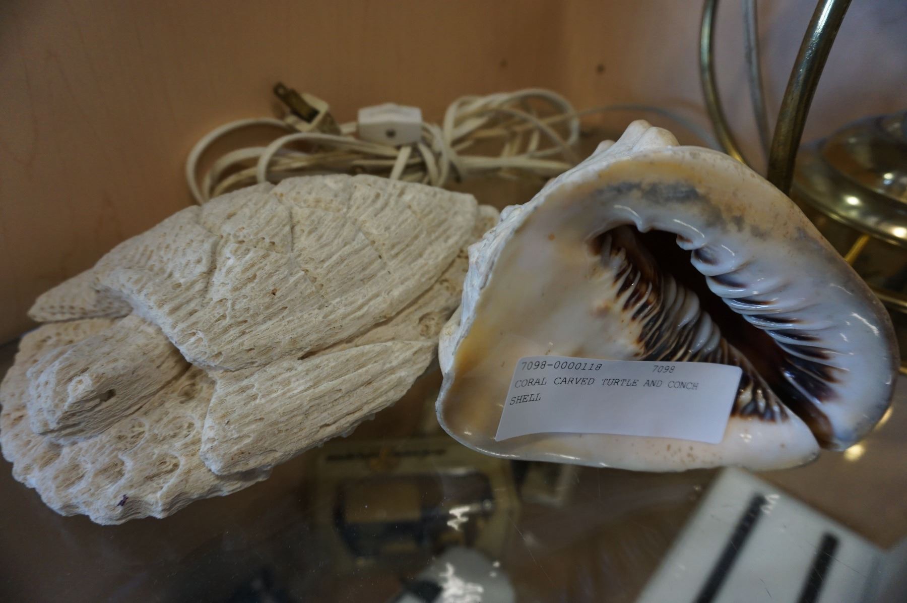 CORAL CARVED TURTLE AND CONCH SHELL
