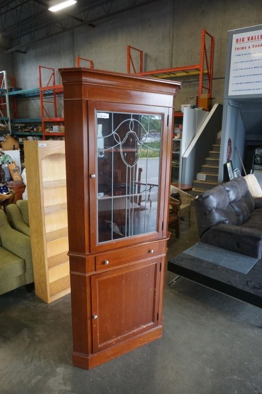 CORNER DISPLAY CABINET WITH LEADED GLASS PANEL