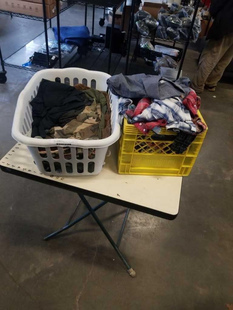 CRATE AND BIN OF DRESS AND CORDOROY PANTS AND SHIRTS