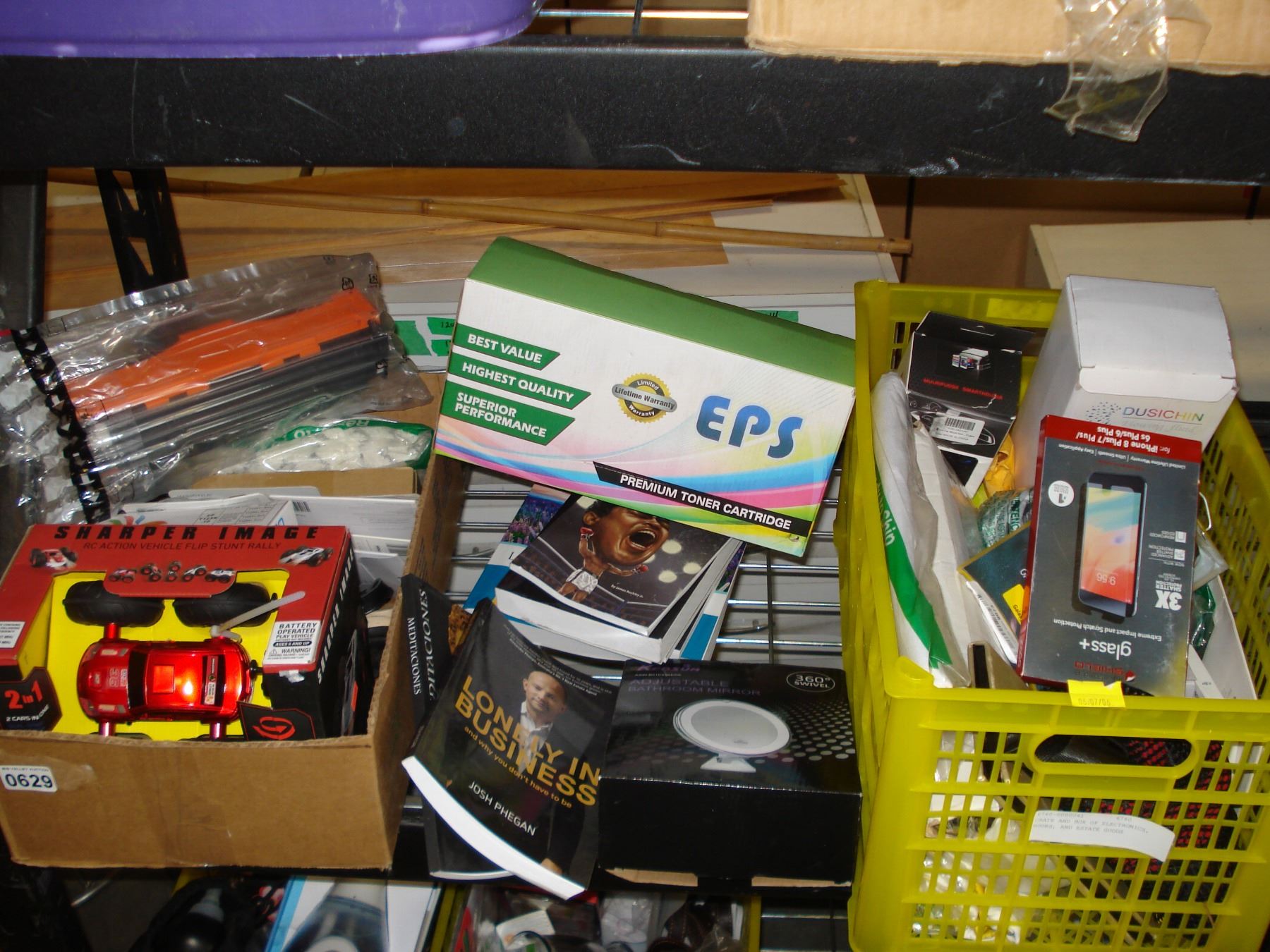 CRATE AND BOX OF ELECTRONICS, BOOKS, AND ESTATE GOODS