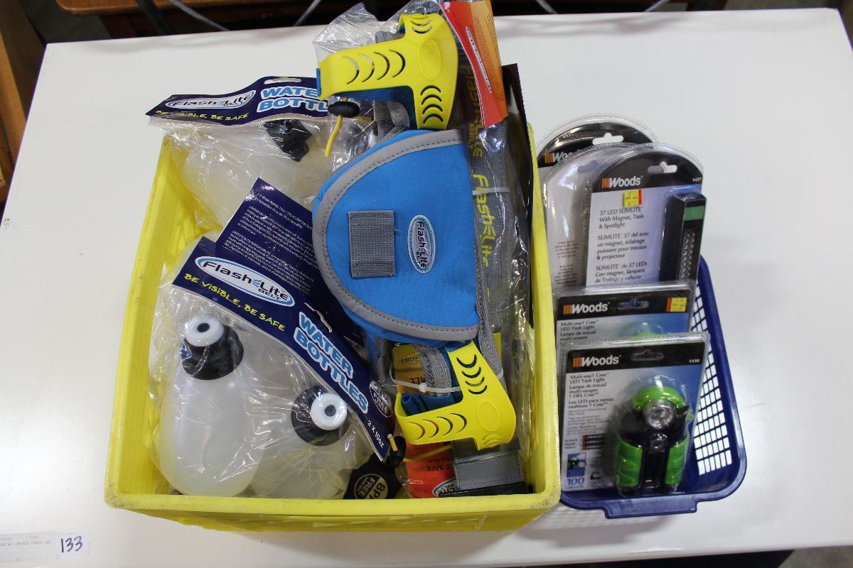 CRATE OF FLASHLIGHT BELTS AND BOTTLES AND FLASHLIGHTS