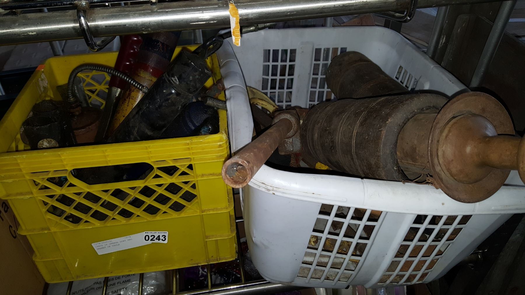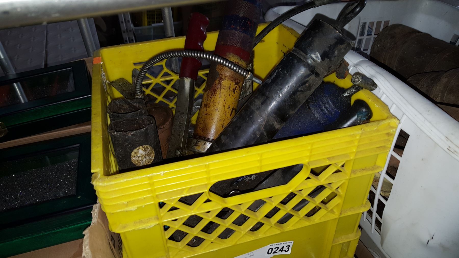 CRATE OF GREASE GUNS AND BASKET OF TOOLS