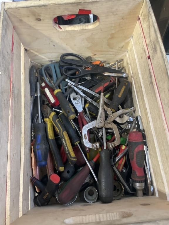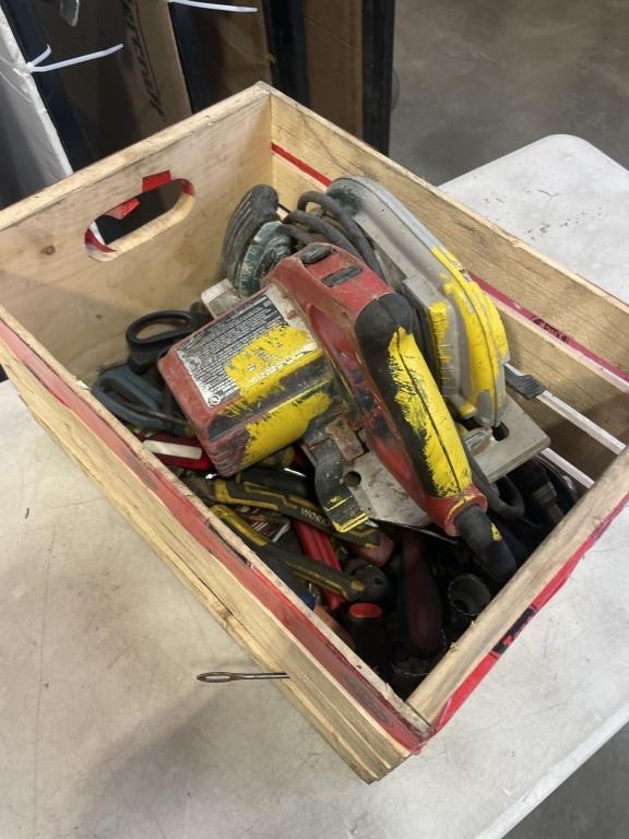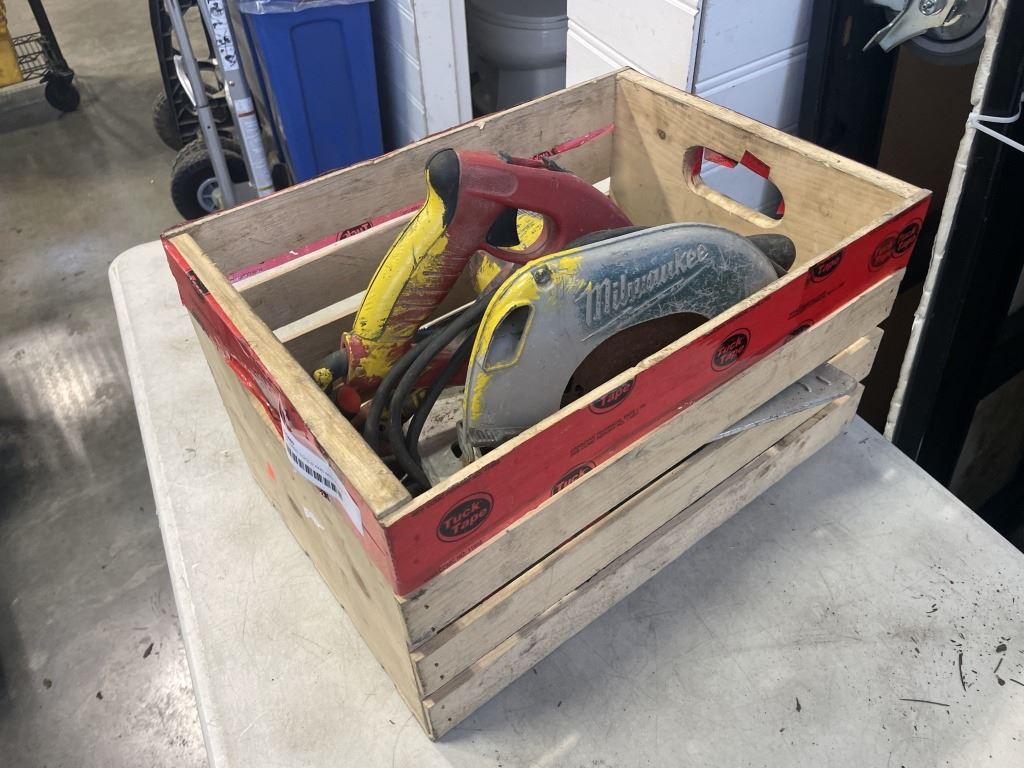 CRATE OF HAND TOOLS AND MILLWAKE CIRCULAR SAW