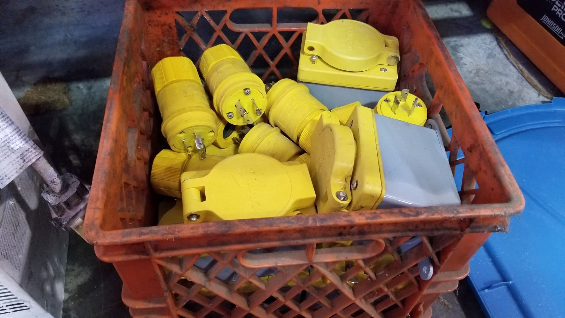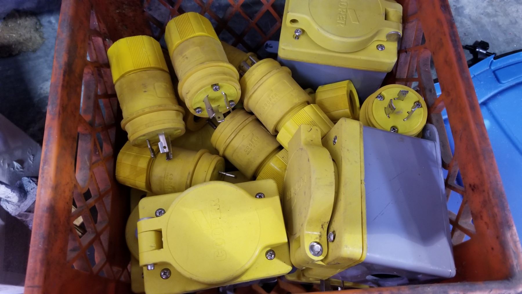 CRATE OF HEAVY DUTY ELECTRICAL PLUGS AND OUTLETS