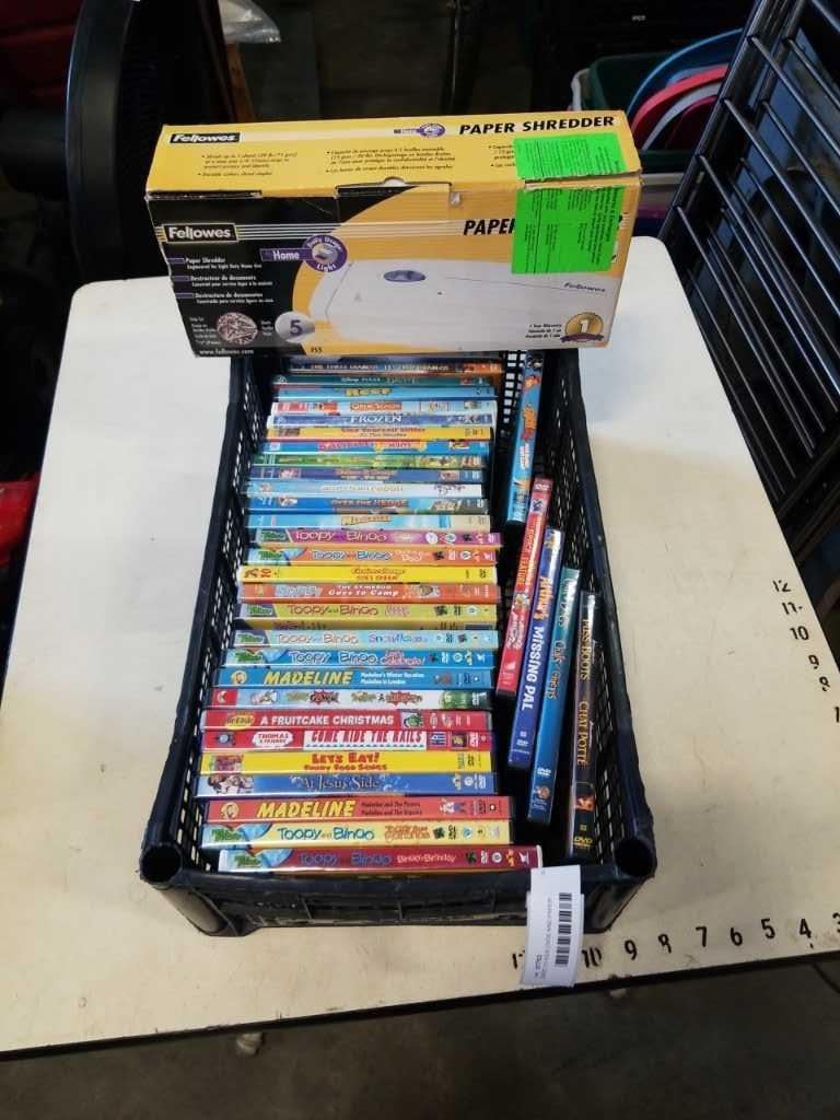 CRATE OF KIDS DVDS AND PAPER SHREDDER