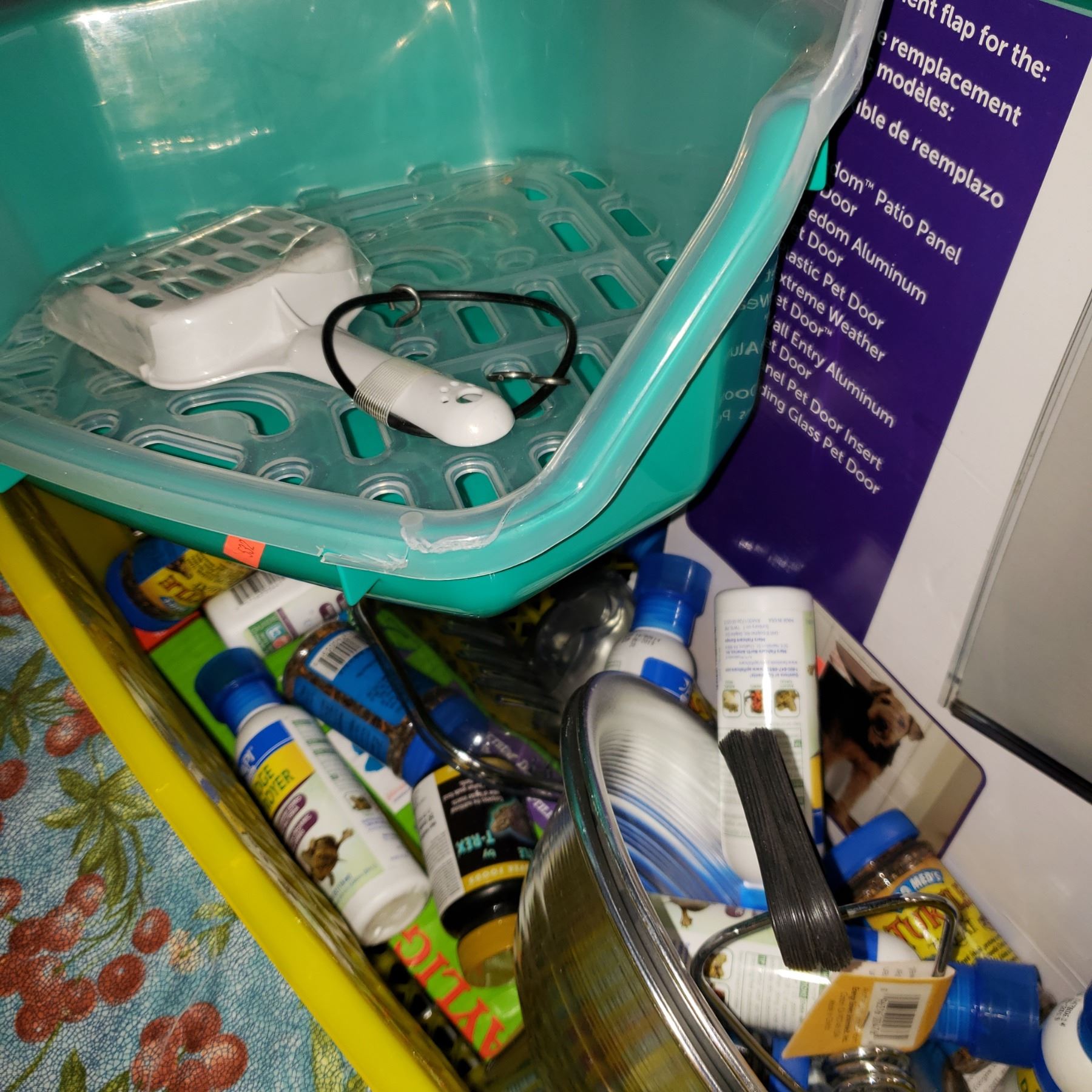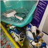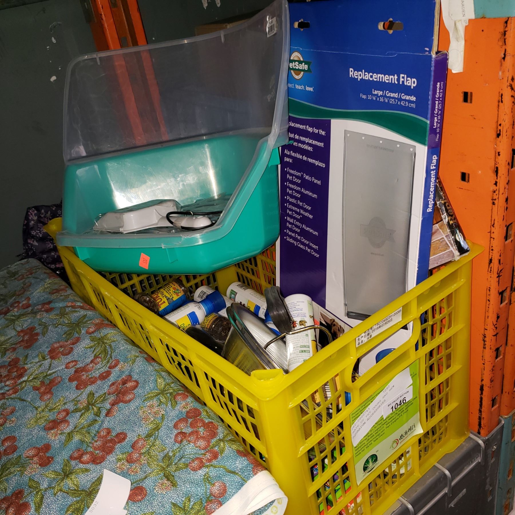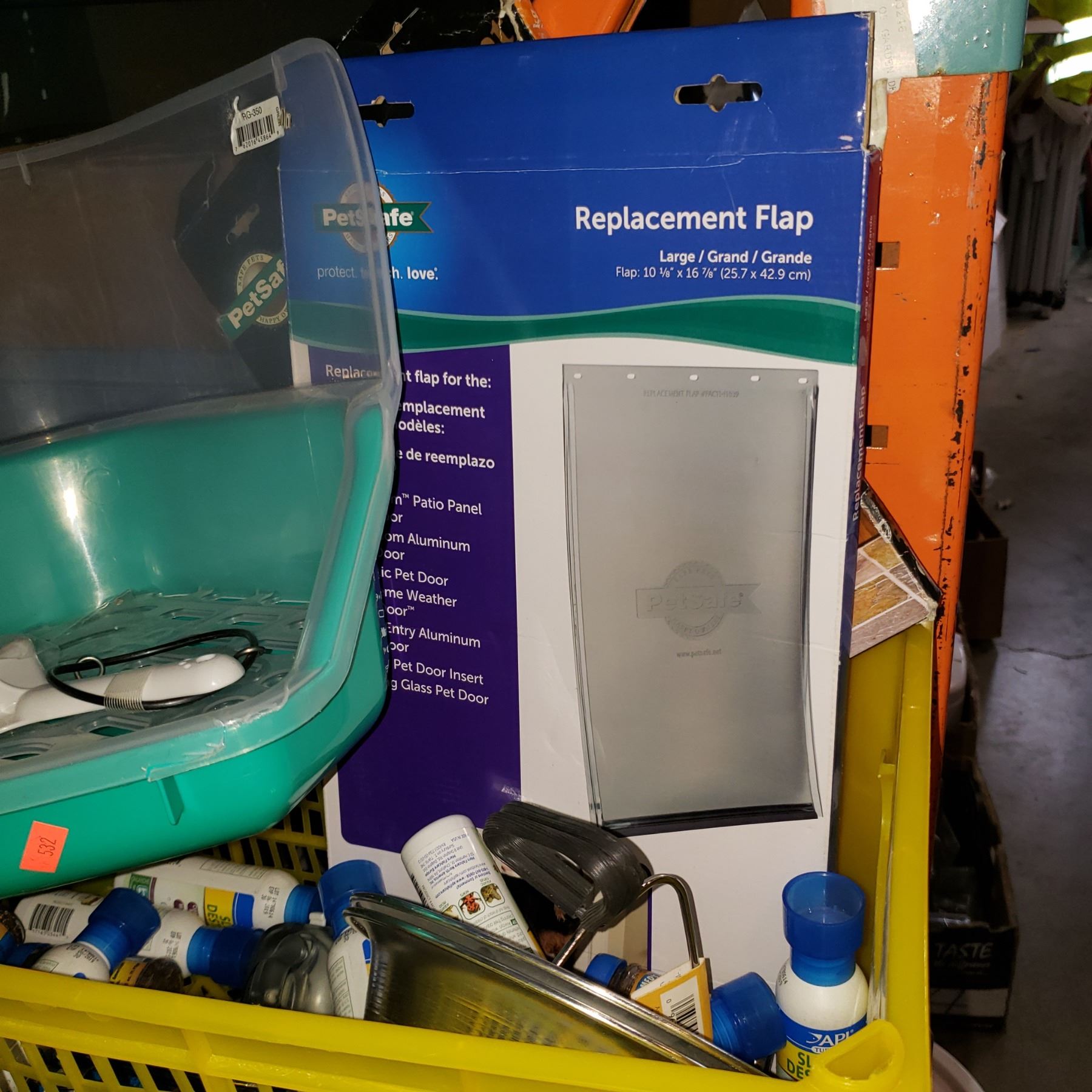 CRATE OF PET DOORS AND NEW AQUARIUM ACCESSORIES