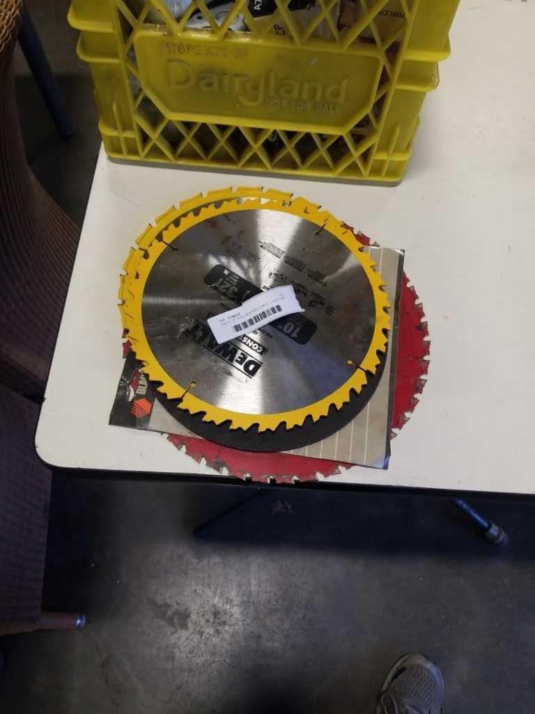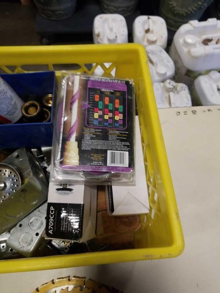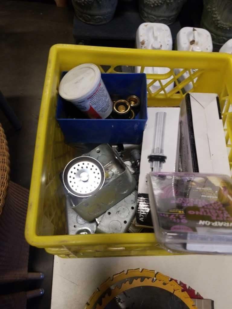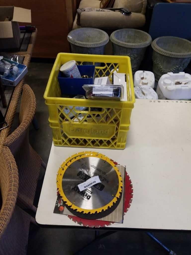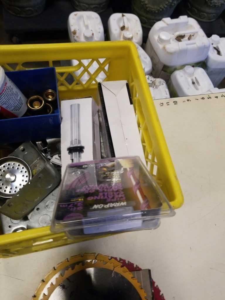 CRATE OF PIPE HEATING CABLE, LAVATORY DRAINS, AND CIRCULAR SAWS