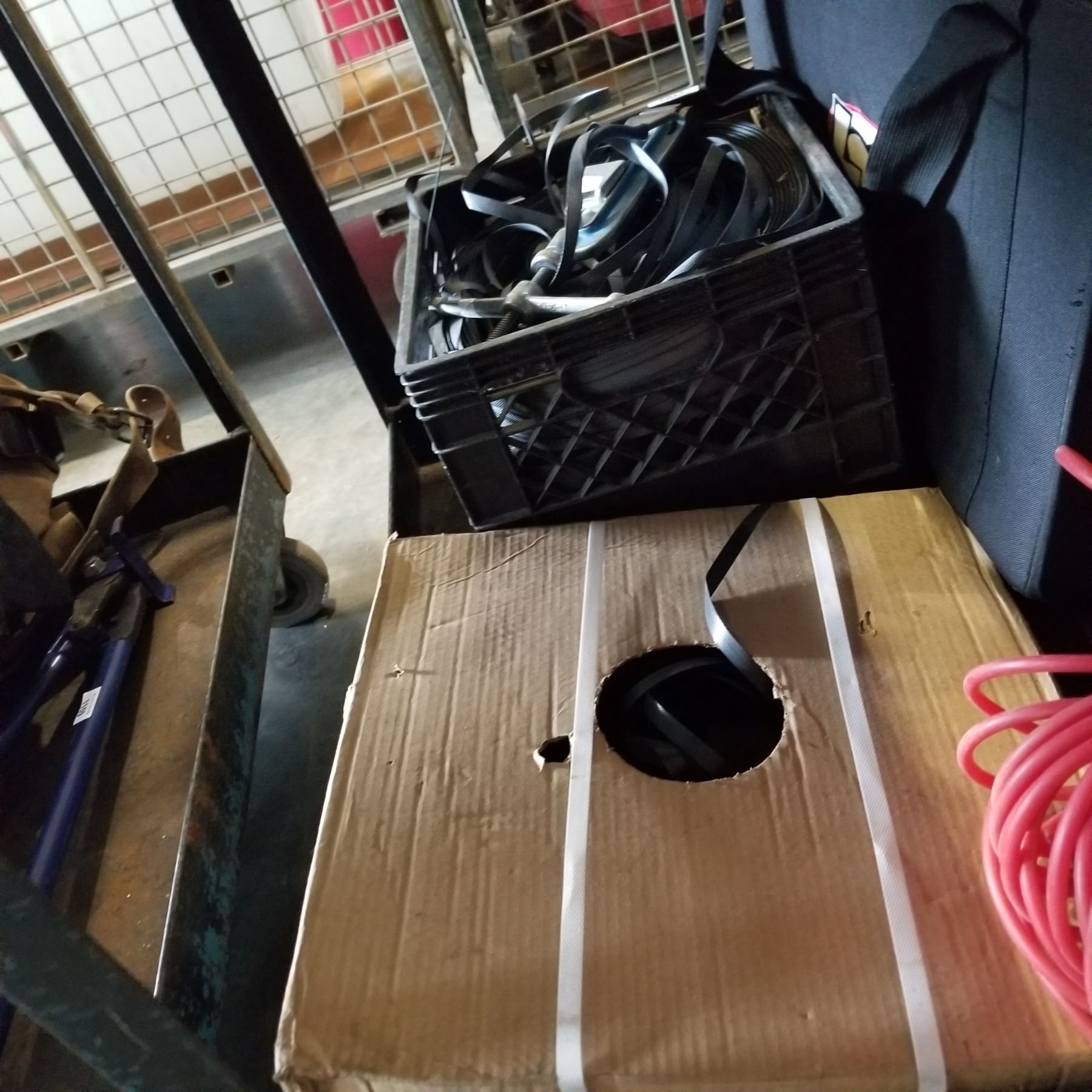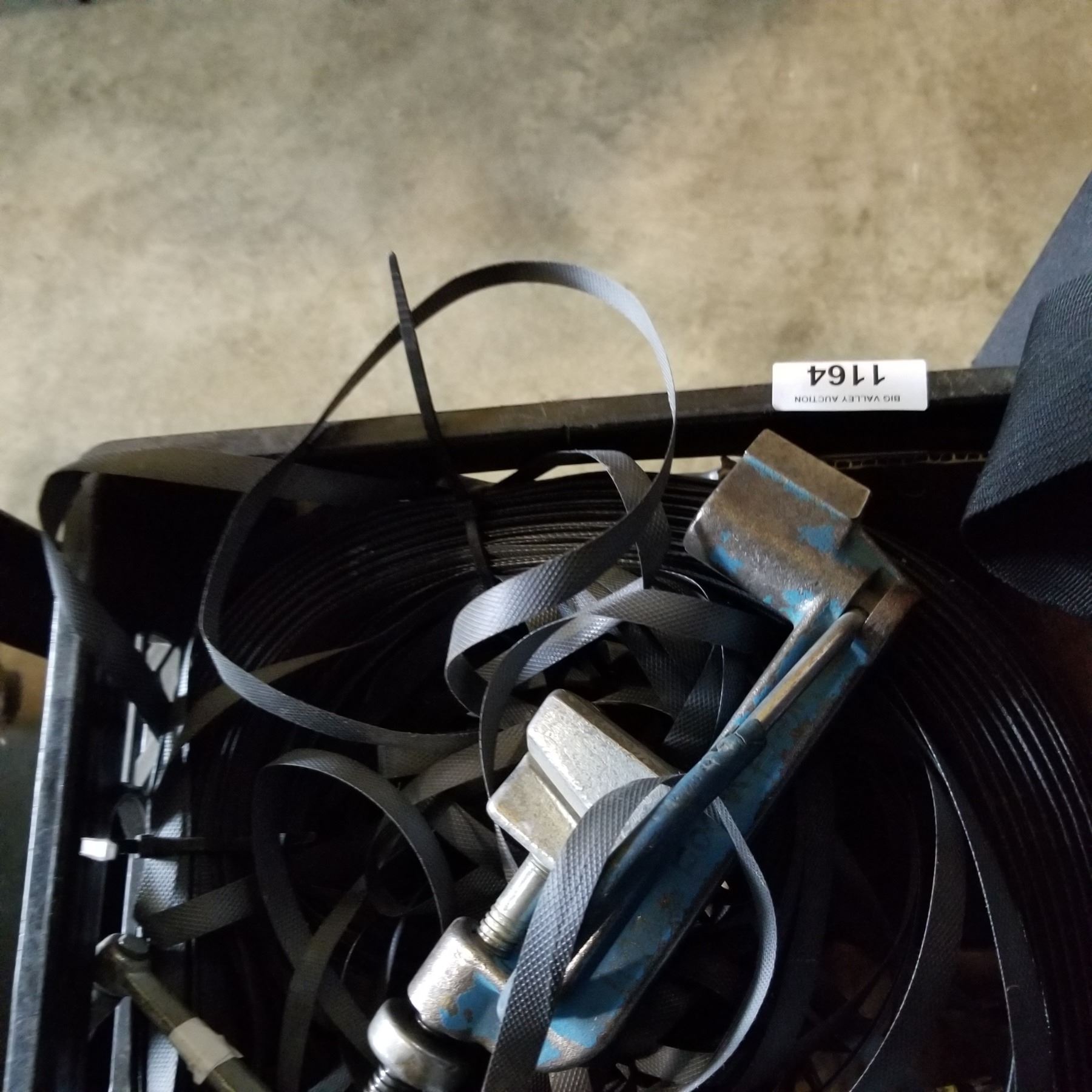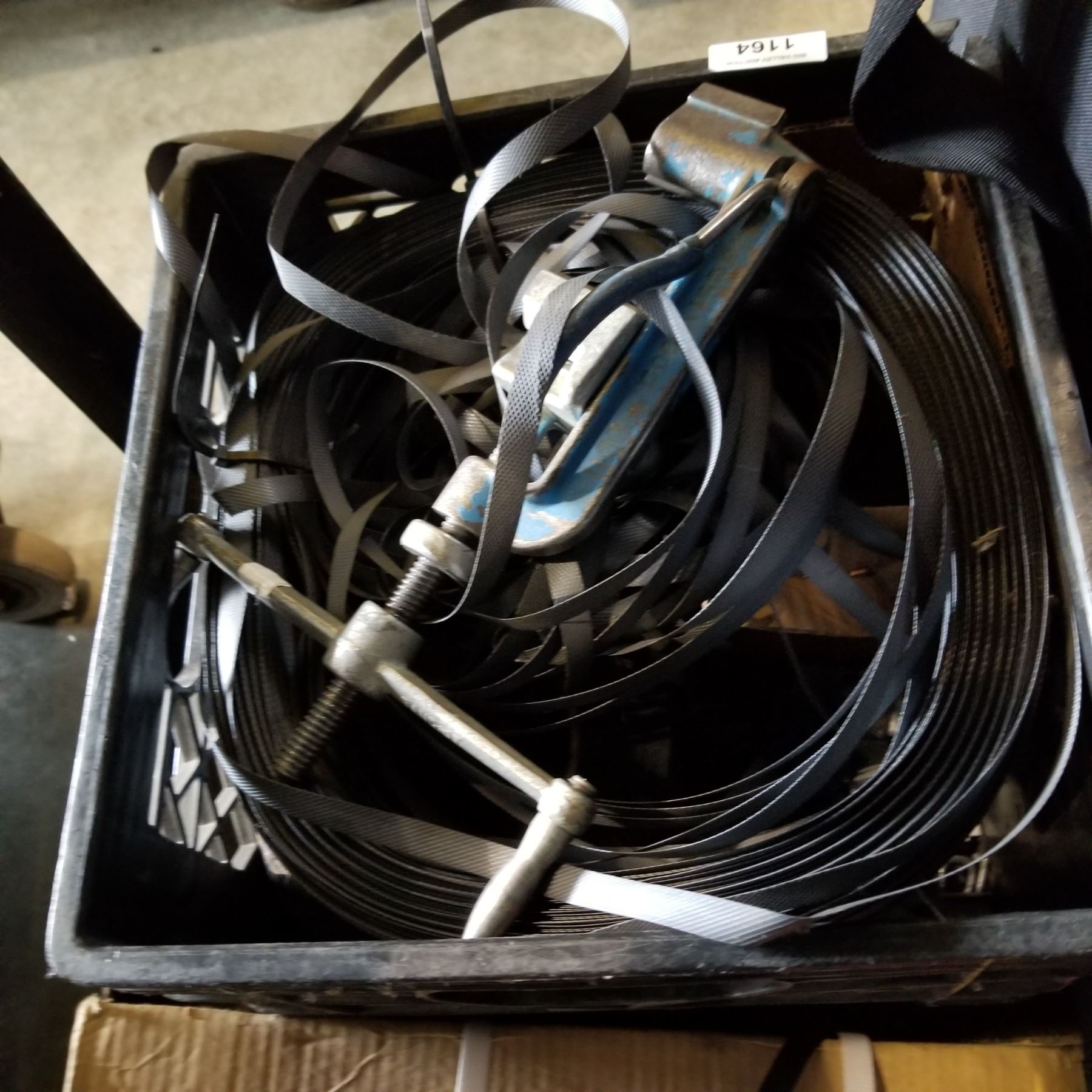 CRATE OF PLASTIC STRAPPING AND TENSIONTOOL W/ BOX OF PLASTIC STRAPPING