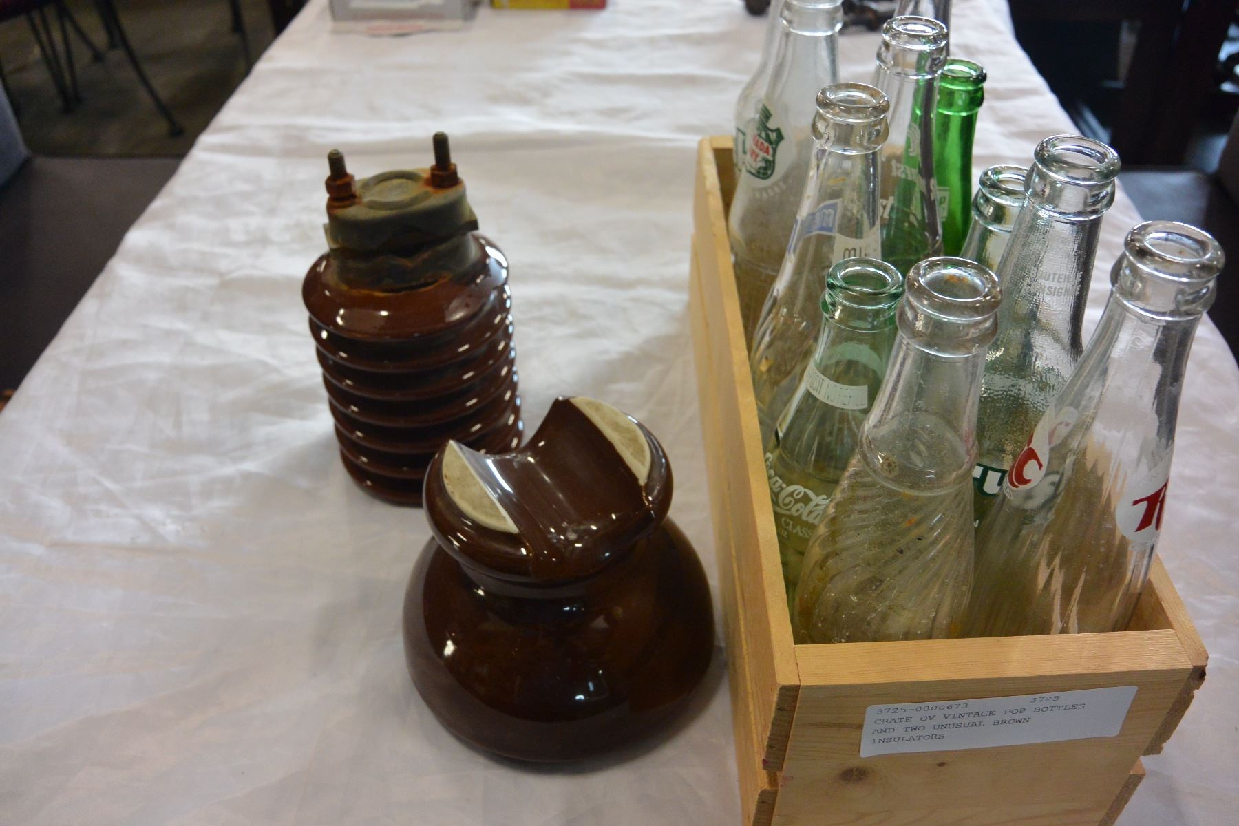 CRATE OV VINTAGE POP BOTTLES AND TWO UNUSUAL BROWN INSULATORS