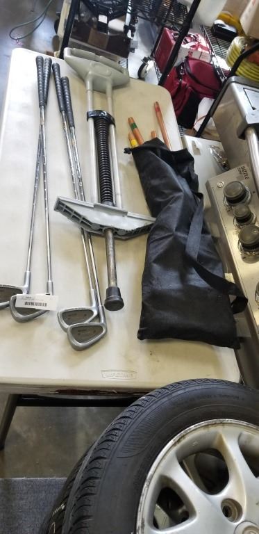 CROQUET SET, POGO STICK AND LH GOLF IRONS
