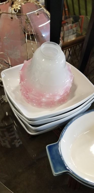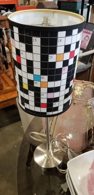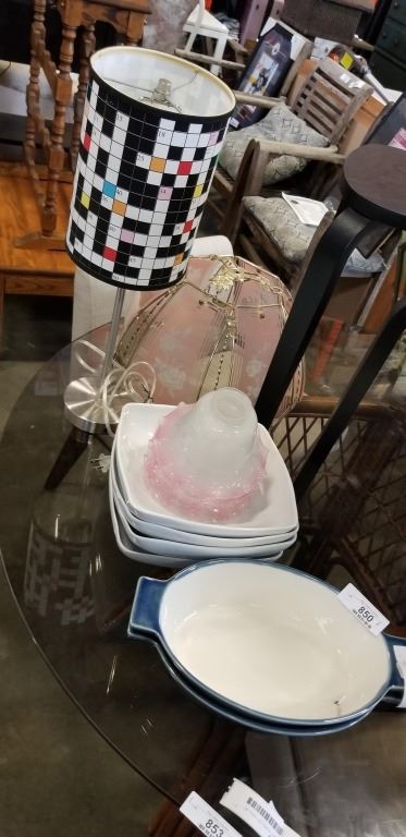 CROSSWORD TABLE LAMP, ASSORTED DISH WARE AND GLASS LIGHT SHADES ETC