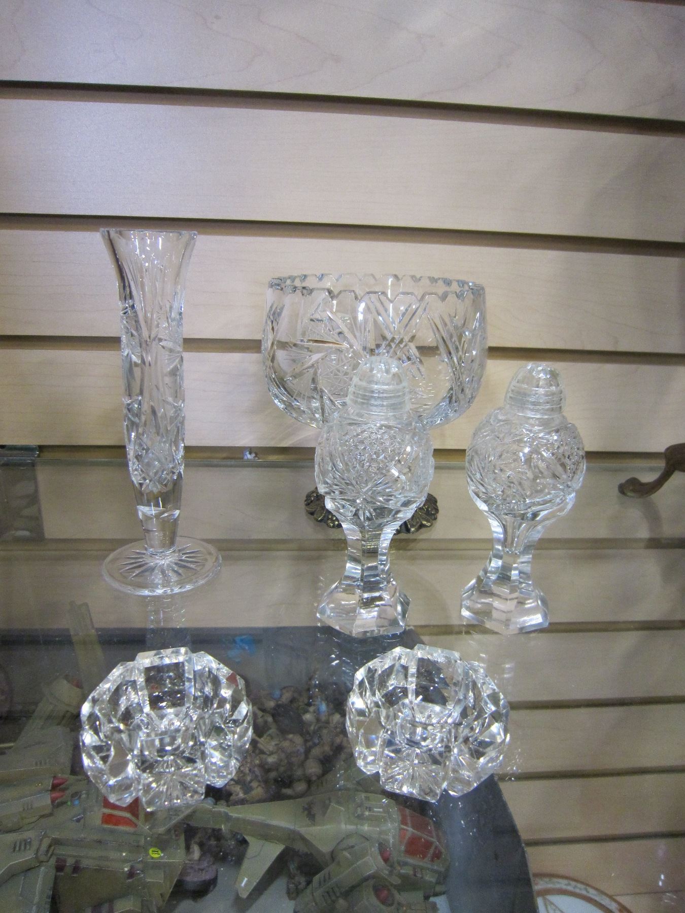 CRYSTAL BOWL ON STAND, SALT AND PEPPER, AND VASE