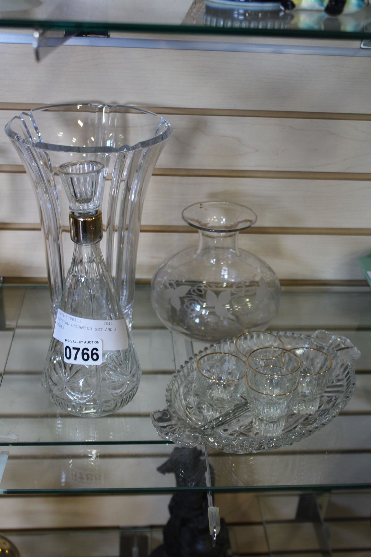 CRYSTAL DECANTER SET AND 2 VASES