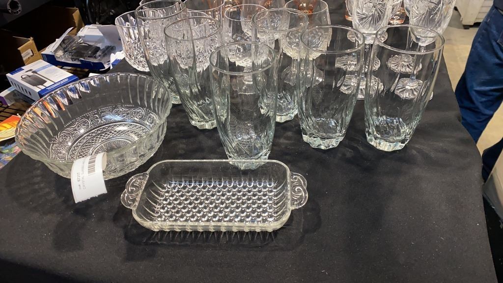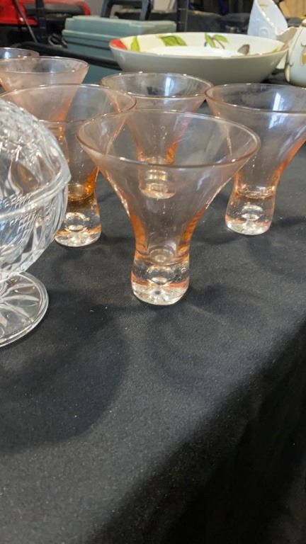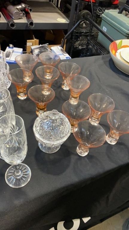 CRYSTAL GLASSES AND STEMWARE, PINK GLASSES, LIDDED CRYSTAL DISH AND OTHER SERVING PIECES