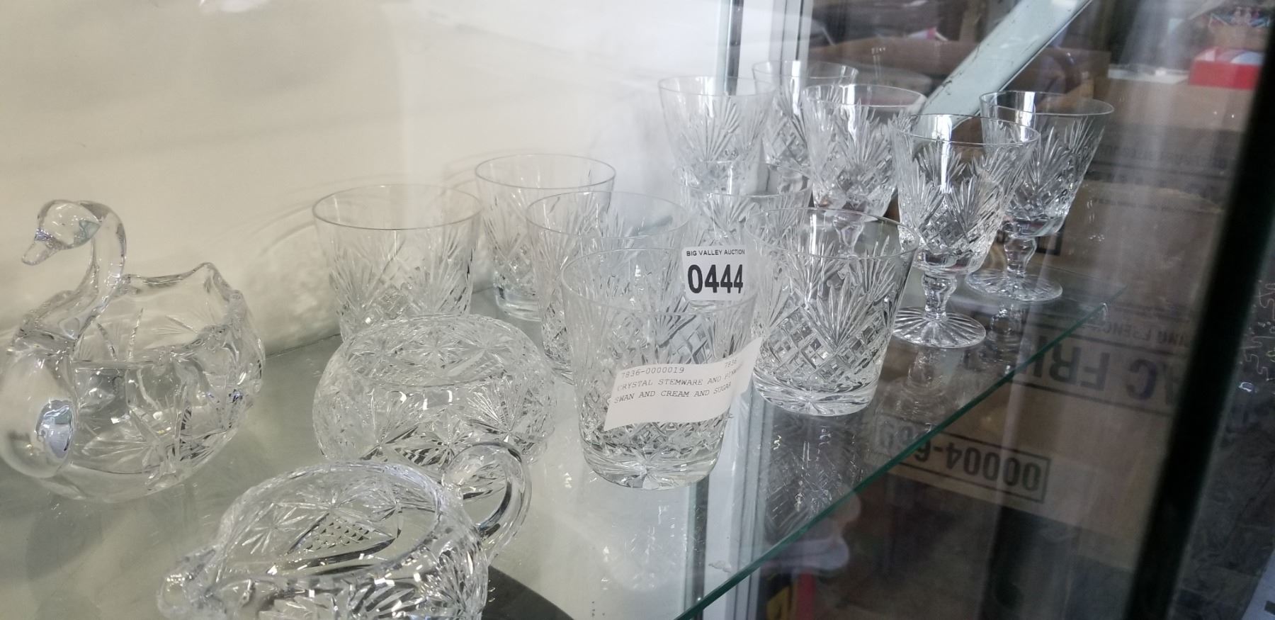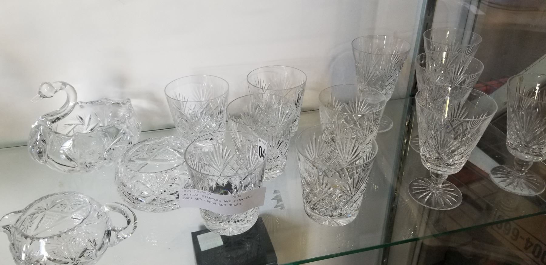 CRYSTAL STEMWARE AND PINWHEEL SWAN AND CREAM AND SUGAR