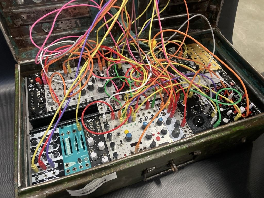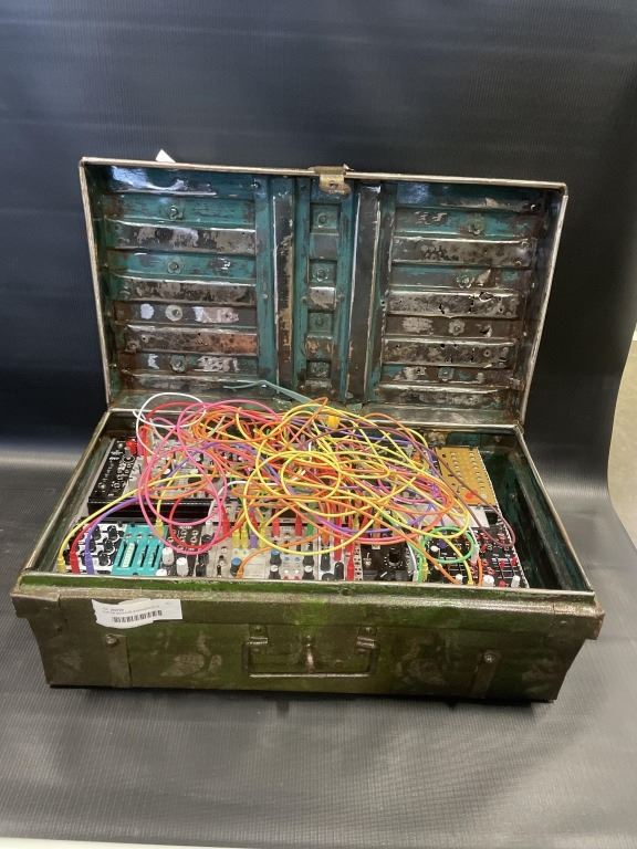 CUSTOM MODULAR SYNTHESIZER IN VINTAGE METAL TRUNK WITH PATCH CORDS