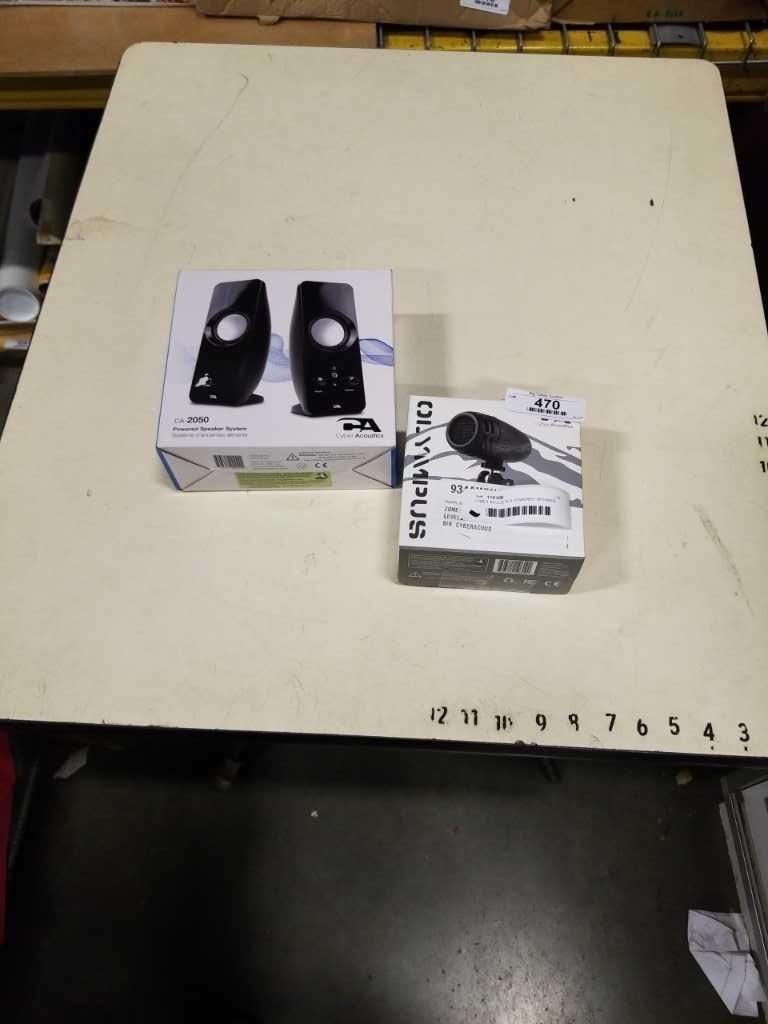 CYBER ACOUSTICS POWERED SPEAKER SYSTEM MODEL CA-2050 AND OLYMPUS MICROPHONE - TESTED WORKING