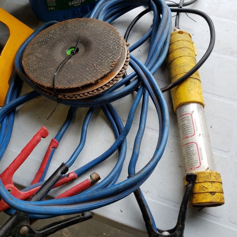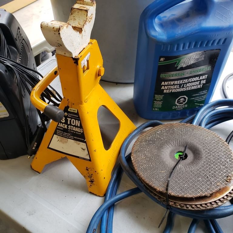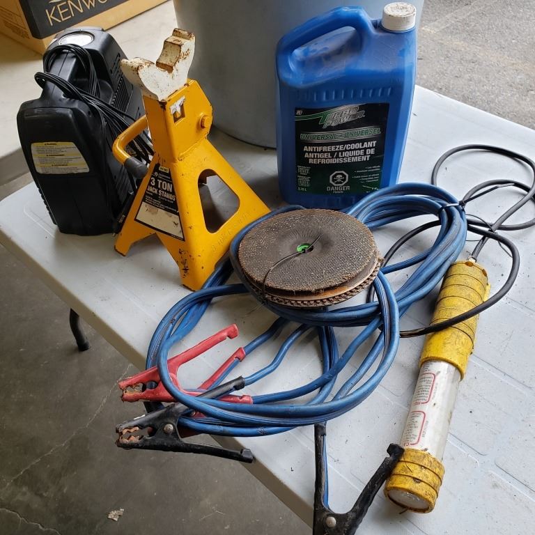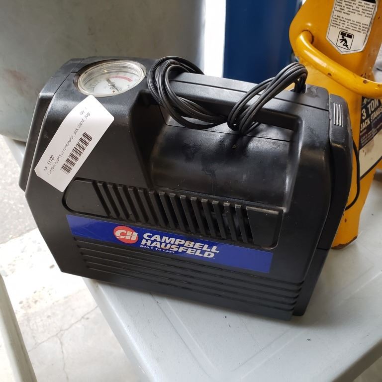 Campbell haufeld air compressor, jack stand, jug of anifreeze jumper cable and trouble light