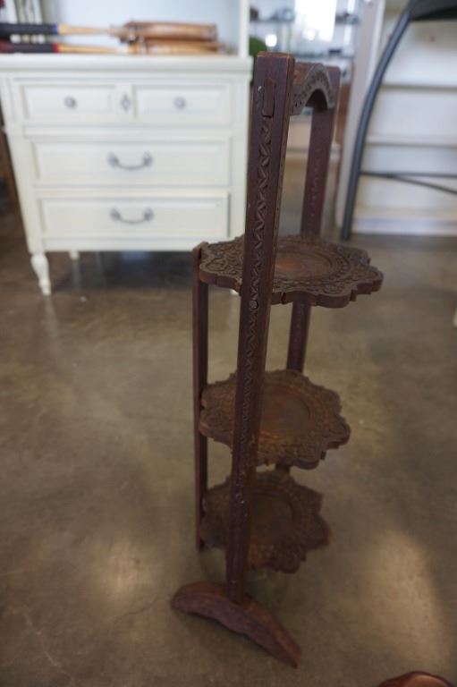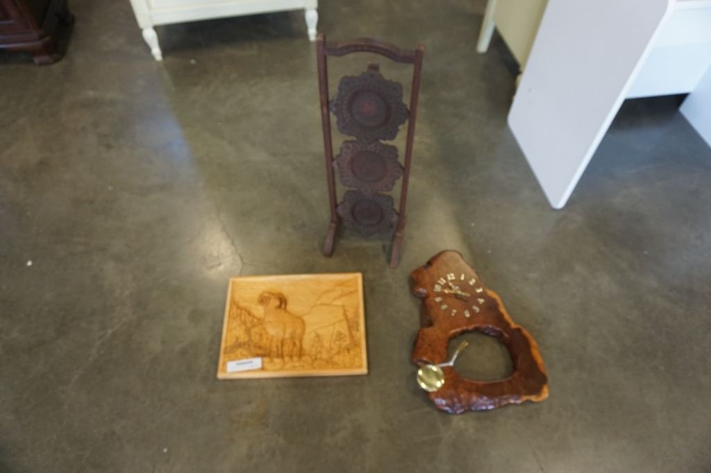 Carved folding 3 tier shelf with big horn carving and burl clock
