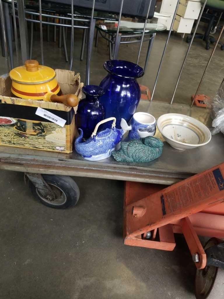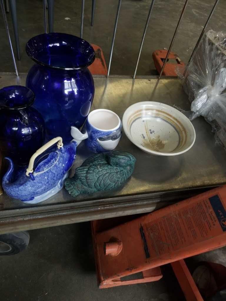 Cobalt glass vases whale jug and lidded fish jar with japanses cooker